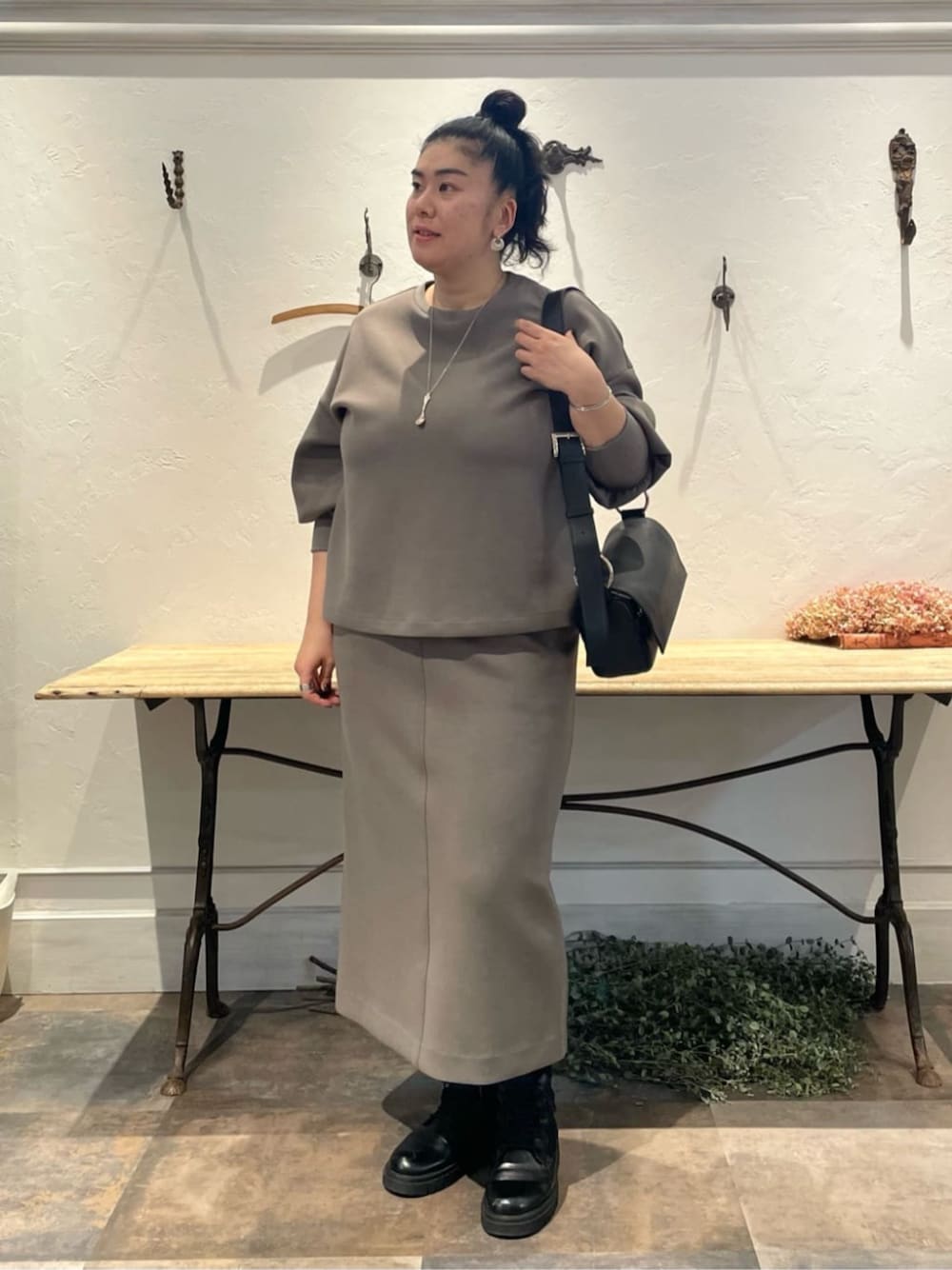 【tops】 着用サイズ : 3 新しくゆったりサイズが登場。 ダンボール素材を使用したカットソー。 保温性に優れていて暖かく着られます。 パフスリーブですが長めに取った袖口のリブがすっきり見せてくれます。 伸縮性:あり 透け感:なし 裏地 :なし 【skirt】 着用サイズ : 3 新しく“3サイズ”が登場。 ダンボールジャージー素材を使用したタイトスカート。 伸縮性のあるダンボール生地とスリット入りなので、タイトなシルエットでも足さばきが良くラクに履いて頂けます。 伸縮性 : あり 透け感 : なし