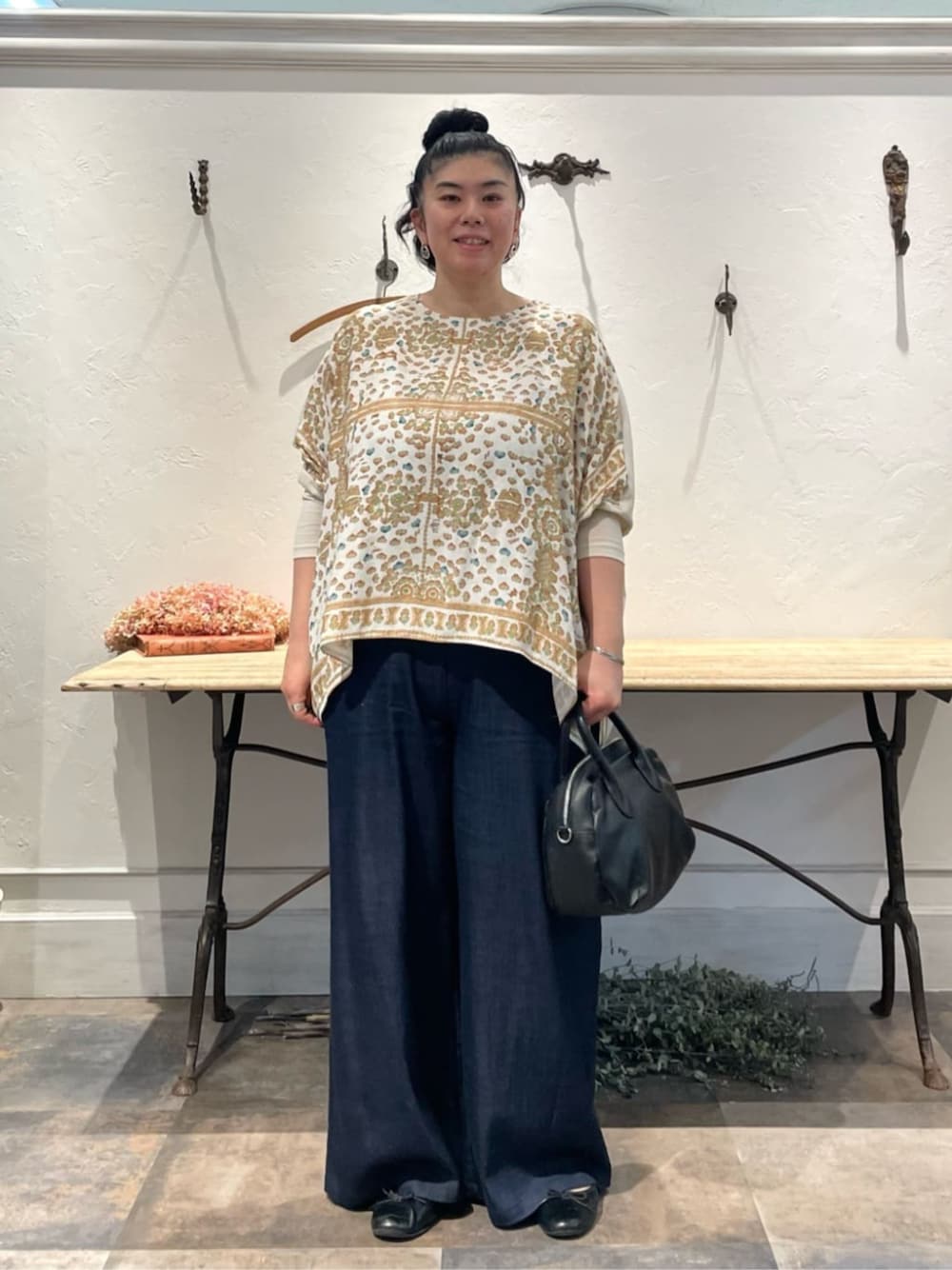 【tops】 着用サイズ : F PARK柄のプリント生地を使用したカットソー。 ゆったりシルエットで体のラインを拾いにくく、落ち感がありすっきり着られます。 洗濯 : 手洗い可 裏地 : なし 【pants】 着用サイズ : 3 ビアズリー人気のウエストリブパンツ。 新しいサイズ“3”が登場。 166cmの私は今までのサイズだと丈が足りなかったのですが、今回はフルレングスで履けました。 また、腰回りも今までよりも余裕があります。 洗濯 : 手洗い可 伸縮性 : ウエスト部分のみあり 裏地 : なし