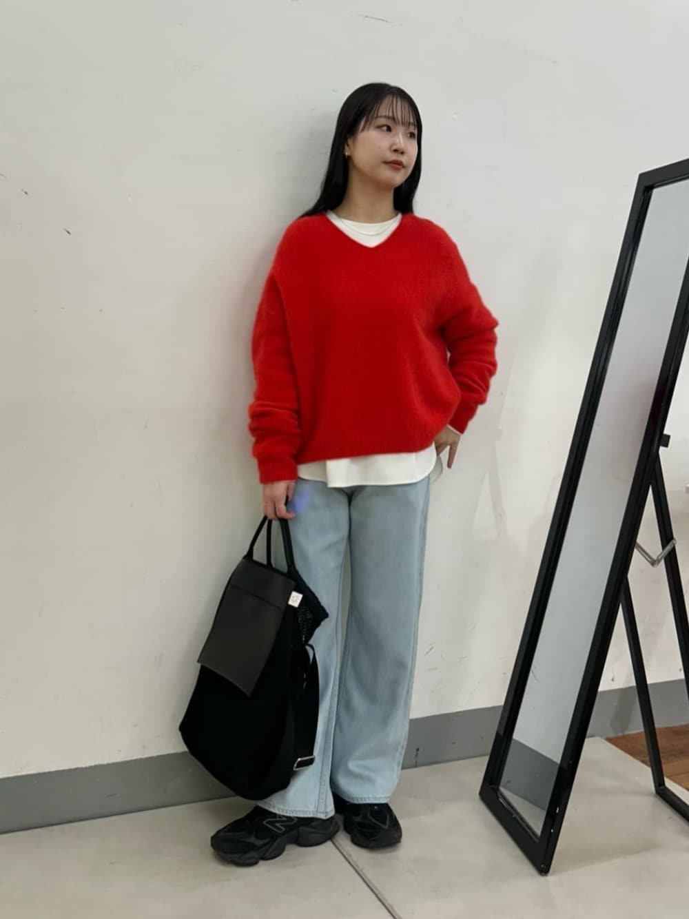 カラーニットとデニムも間に 一枚Tブラウスをチラ見せすると パキッとせずナチュラルに合わせられます◎ 黒の大きめバッグとスニーカーでまとめて カジュアルコーデ