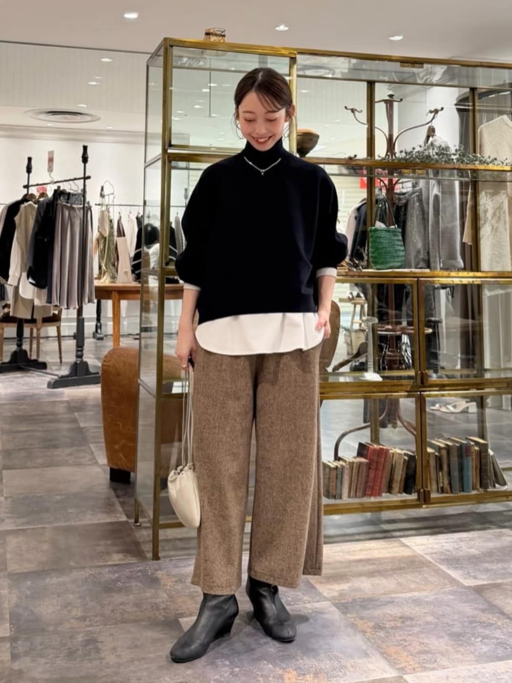 【ニット】着用:ネイビー・Fサイズ ベーシックな形で着回しやすい、ハイネックのドルマンニット。 ドルマンスリーブですが、袖口と裾部分はリブ仕様でメリハリのあるデザイン◎ 154cmで腰にかかるくらいの丈感で全体のバランスが取りやすいです。 【ブラウス】着用サイズ:0 1枚でも、重ね着でも、ジャケットやベストのインナーとしても 活躍する万能ブラウス。 白でも透けにくいのでインナーを気にせず着られます◎ 154cmで0サイズが丁度良い丈感◎ 【パンツ】着用サイズ:0 ウエストリブシリーズに裏地付きの暖かい素材が登場。 赤や黄色のネップを使用しているので、シンプルなトップスと 合わせてもサマになります。 裏時付きなので、チクチク感などなく安心して穿いていただけます◎ 154cmで0サイズ着用しており、足首にかかる丈感。 フラットシューズでも問題なく穿けます。