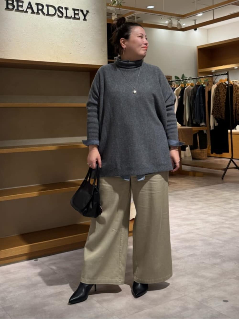 【ニット】 ちくちく気にならないニット ゆったりしているので着やすいです。 腰まわりもしっかりカバーしてくれます。 お袖にリブがあるのですっきり着れます タートルを中側に折り返して着ると首まわりすっきりしますよ。 【シャツ】 柔らかいシャツです。 柔らかい生地ですが、身体のライン拾わないので嬉しい。 カラーがムラになっているので絶妙にすっきり見せてくれます。 二の腕きつくなく、ボタンもちゃんと閉めれます。 着丈もお腹やお尻隠せるので、重ね着してもかわいいですよ! 【ボトム】 2サイズ着用 ウエストがリブになっていて、ゴムの所を折り返して着るとお靴やトップスの着丈によって変えれるのが魅力です。 お腹とお尻がとにかく楽なんです! 秘密は、股上が長めなので私のようにポッコリお腹やヒップが出ている方におすすめなんです♩ リピ買いしてしまうほど楽ちんですよ!