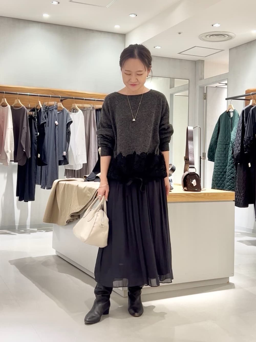 【裾レースニット】 ウール素材が柔らかく 着心地が良いニット。 低身長さんは スカート、ワイドパンツ、キュロットスタイルのコーディネートの時には、 裾の紐を絞って短い着丈で アレンジすることがおすすめです! バランス良く着ていただけます。 ▶︎着用詳細 tops 裾レースニット Fサイズ ウールポンチョコート Fサイズ bottom シワシフォンパンツ 0(S)サイズ goods がま口ネックレス ラウンドミニボストン