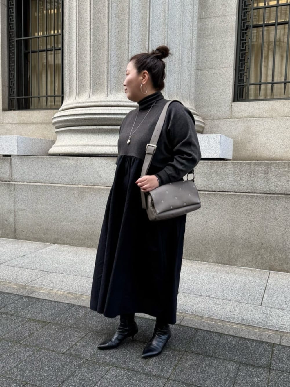 【ワンピース】1サイズ 二の腕がゆったりしていて二の腕気にならないです! タートルでキツそうに見えますが、そこまでぴったりしてないので着やすかったですよ♩ 切り替えが山型になっているので、すっきり見えます!!! サイドに切り替えがあるので、ボリューム出過ぎないのも嬉しい。 【バッグ】 レザーだけどとっても軽くて持ちやすいです。 ショルダーが長さ調節できるので、用途に合わせて コーディネート楽しめます。 ドットの刺繍が甘すぎず上品に持てるので、 コーディネートを引き立ててくれますよ! バッグの蓋に磁石が付いているので旅行にも安心です。