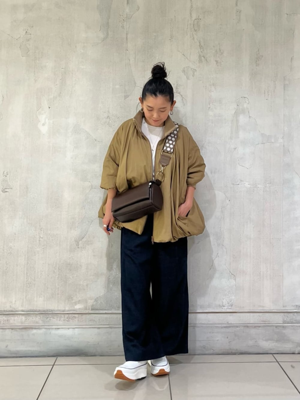 【outer】着用サイズ F size ふわっとボリューム感がおしゃれなアイテム バルーンのシルエットが柔らかな雰囲気に 軽くて羽織りやすく お袖も柔らかなリブなので、キュッとあげやすいデザイン すっぽりヒップラインが隠れるのも嬉しいポイント 【inner】着用サイズ 0size ドルマンデザインの着るだけで すっきりタックインしたようなブラウス インしなくても安心なブラウス スカートやワイドパンツにもおすすめのアイテム 軽さのあるブラウスで今の時期から長いシーズン着やすいブラウスです。 【pants】着用サイズ 1size ストンとしたシルエットのパンツ ウエストはゴムになっていて穿きやすく ほんのりツヤ感がキレイ見えするパンツ シワになりにくいのでご旅行などにもおすすめです。