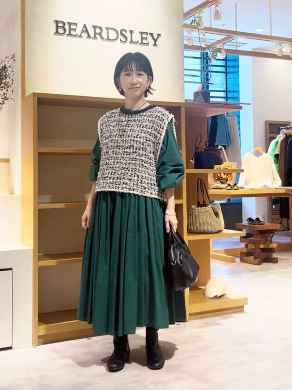 ◯着こなしポイント 年齢を重ねると、ゆったり服が一歩間違えるとだらしなく見えたりしますよね…。 ワンピースとニットジレの組み合わせなら、ちゃんと女性らしく、ちゃんとおしゃれ見え。 1パターン化しがちなワンピも、ジレを重ねるだけで見違えるほど垢抜けます✨ 【ワンピース】1サイズ ギャザーがふわりと揺れる、毎年大人気のロングワンピース。ストンと落ちてすっきり見え、着太りしにくいのが本当にありがたいアイテム。胸元のラインも拾わず1枚でも安心。深いグリーンが肌を綺麗に見せてくれる、頼れる存在です。 【ジレ】 マンネリしがちなワンピースやトップスに、変化が欲しい、そんな日にちょうどいいのがこのジレ。見た目はきちんとツイードなのに、びっくりするほど伸びるニット素材でノンストレス。袖ぐりが広いからドルマンも重ねられて便利!行事でジャケットだと堅い…という時の“絶妙なきちんと感”が叶う一枚。卒入学式にも使える優秀さです。 【バッグ】 人気のミニラウンドボストンバッグ。 小ぶりなのに500mlペットボトルもすっぽり入る収納力が魅力です! ポケットも多く、荷物の整理がしやすいのもポイント。 斜めがけもできるので旅行などにもピッタリ。 牛革の質感が上品で、どんなシーンにも馴染む万能アイテムです。 【シューズ】36サイズ着用。 ほどよく細身で上品に見えるのに、とにかく歩きやすい。ブーツって可愛いけど重かったり、足が疲れたりしがち…という悩みが、この一足で解決。ストンとしたワンピと合わせると、足元にキュッと締まりが出て、全体が大人っぽく仕上がります。ジップがあるため着脱もしやすいです。 【ネックレス】 花瓶モチーフが可愛いネックレス。 コードタイプで長さを変えられるネックレス。 その日の気分や首元の空き具合でアレンジできるのが便利。 シンプルコーデに少しだけアクセントを足してくれます✨
