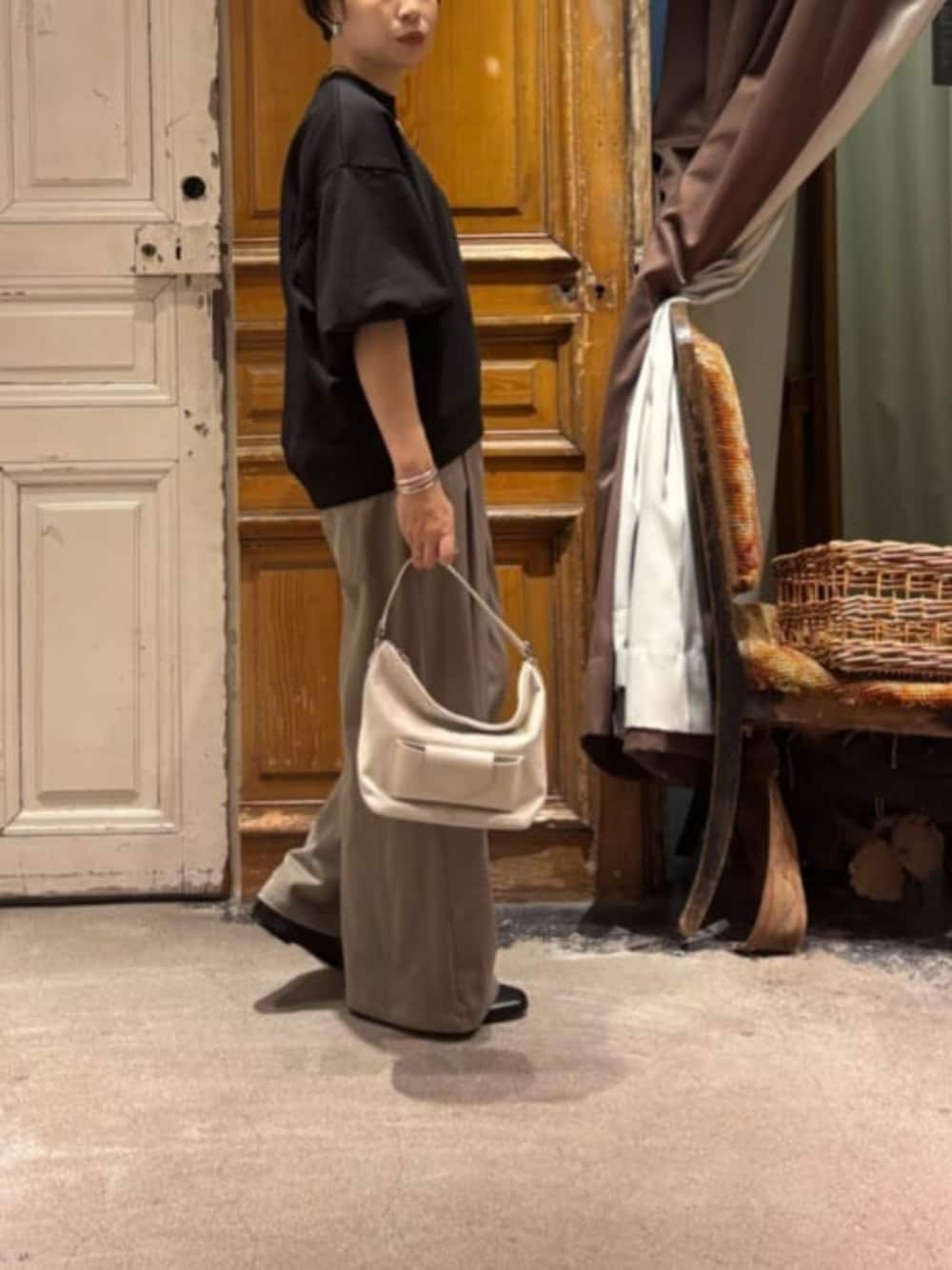 【トップス】Fサイズ トレーナーって大好きなんだけど、 春、秋だけしか着られない。。ってイメージありませんか? けど、パフスリーブが大人可愛い半袖スウェットが登場♪ 生地も柔らかく厚手すぎずゆったりしているので、長く着られる一枚です。 丈が長すぎず短すぎの良い塩梅。 パギンスとのバランスもばっちりです。 インしたくない派さんにもオススメ。 裾はラウンドしたシルエットなので、 ワイドパンツと合わせてもバランスが良くなりますよ🎶 ベージュと合わせてキレイめコーデに仕上げました。