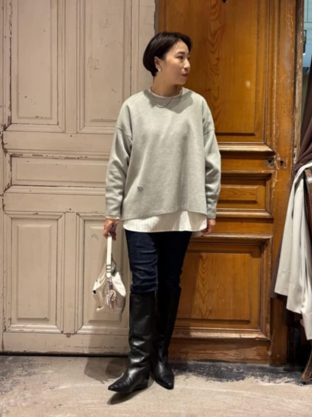 【トップス】 ビアズリー で人気のサイドジップシリーズに、 ニット素材が登場✨ スウェットタイプとは違って、 ニット素材なのでボリュームが出ないため、 すっきり、着痩せてみえて嬉しかった😊 スウェットとかトレーナーってボリュームが出やすいので、ボトムにワイドパンツを合わせると、大きく見えがちですが、 これなら丈感も長すぎないので、スカートと合わせてもバランスがとりやすかった印象。 伸縮性のある素材なので、着心地も良かったですよ! 首まわりもコンパクトなので、インナー見えちゃう問題も心配なしです。 そのままでも、大人可愛いニットですが、 ストライプシャツを重ね着しました。 カジュアルな中にも、 大人キレイめなコーデに仕上げました。