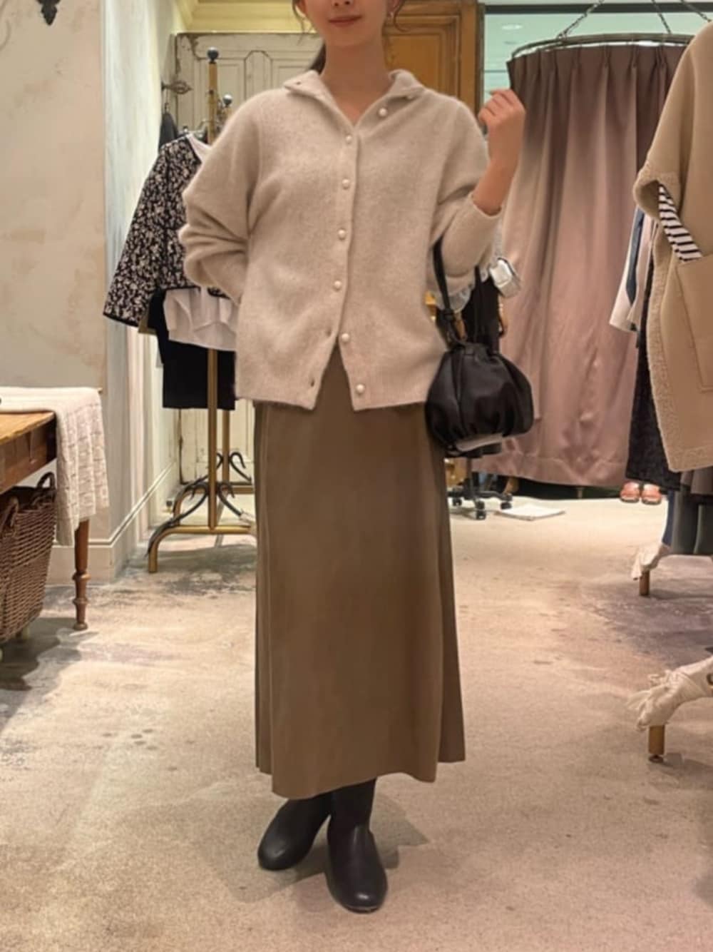 【トップス】Fサイズ 前後両方で着られるパールが可愛いニット。 カーディガンとして春先まで長く着られます。 袖口はパフスリーブとリブニットになっていてたくしあげると、違った雰囲気を楽しめます。 首元までの長さで安心の温かさです。 【スカート】0サイズ スウェード素材のマーメイドスカート。 後ろにタック入りで、動きが綺麗なだけでなくヒップのラインもカバーしてくれます。 落ち感のある素材なので、広がらずストンと綺麗なシルエットにしてくれます。 裏地付きで暖かく、真冬まで安心です。
