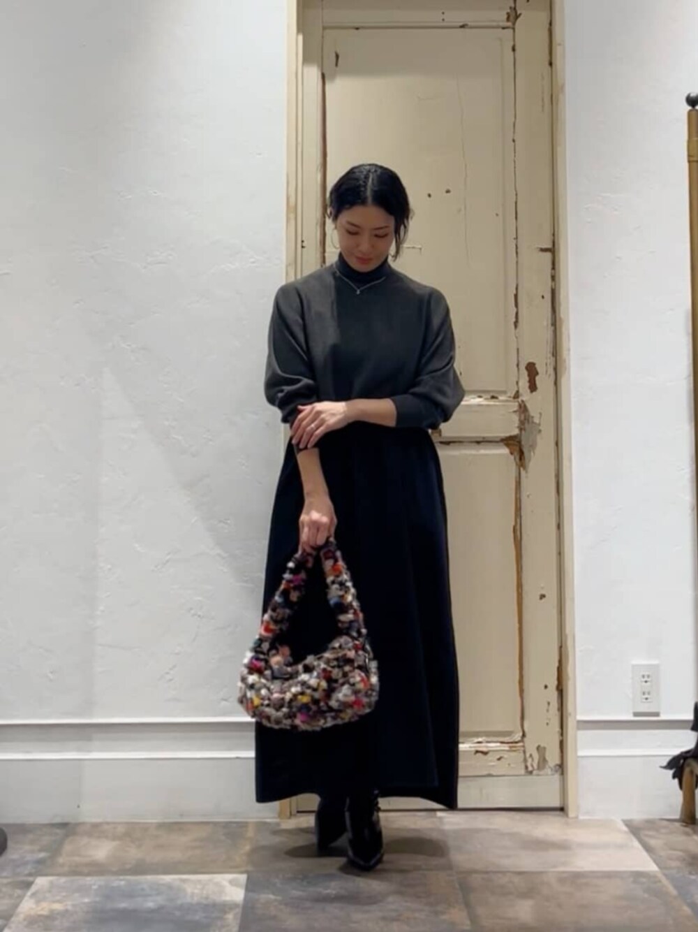 ミンクファーのカラフルバッグをアクセントにしたコーディネート。 異素材の組み合わせがお洒落な、フレアシルエットのワンピース。 一枚で雰囲気のあるデザインです。