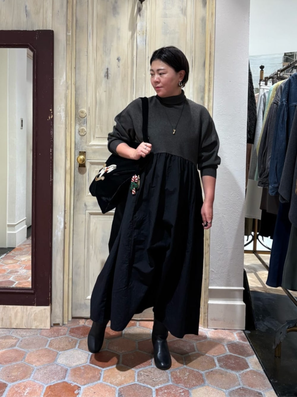タートルネックニット×布帛のギャザースカートを組み合わせた上品なワンピース。 異素材の組み合わせがシンプルながらも、大人の洗練された雰囲気を演出します。 チクチク感の少ない程よい厚みのニットと、広がりすぎない絶妙なシルエットのスカートが好バランスで、動くたびに女性らしさを引き立てます。 1枚でスタイリングがサマになる、頼れるアイテムです。