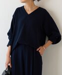 ブラウスの顔まわりはすっきりみえるVネック。 少し深めのVネックなので、黒のキャミを今回入れました。 下着感が出にくい黒がオススメです。 パンツは、裾にリボンがあるので雰囲気を変えられます。 シワにもなりにくい素材なので、 幅広いシーンに活躍します。 セットアップだと、 お仕事や行事ごとはもちろん、 忙しい朝の強い味方になりますよ。