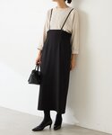 【ブラウス】Fサイズ 同素材のスカートと合わせたコーディネート。 ほどよくハリのある素材感が、シンプルな中にもきちんと感を演出。 オフィスシーンから少し改まったお出かけまで、幅広く活躍する一枚です。 【スカート】Fサイズ スカートとしても、肩紐を付けてジャンパースカートとしても着用できる上品な2WAYスカート。 ウエストの内側で3段階ウエスト調節が可能なのも嬉しいです。 インナー次第でカジュアルにも綺麗めにも使える万能アイテム◎