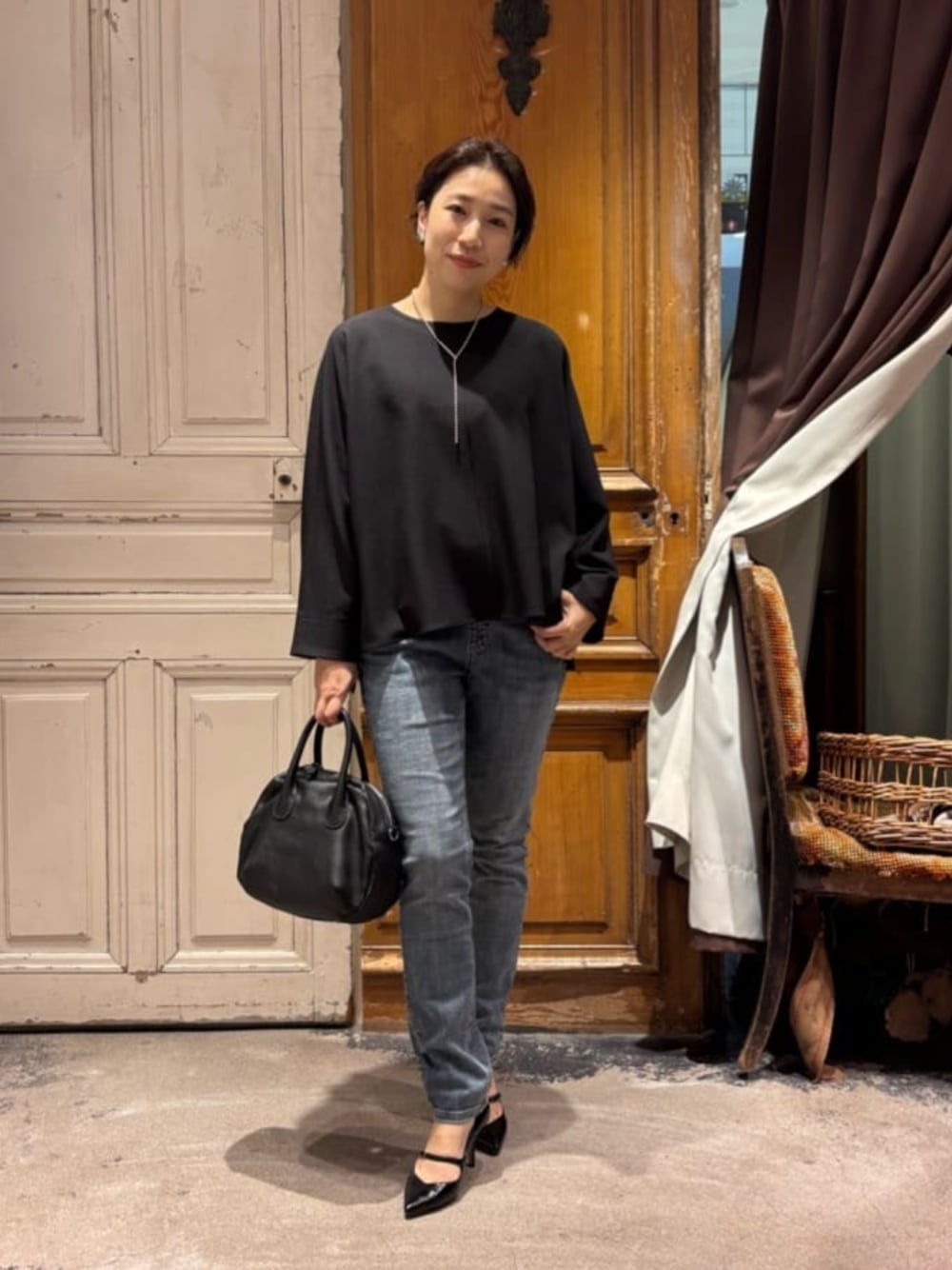 きちんと感のある黒ブラウスは、 デニムコーデでも大人キレイめカジュアルになりました。 微光沢のブラウスで、 黒なので透ける心配もなく、 シワにもなりにくいので、 デイリー使いにオススメです。 着心地も、とろんと滑らかでしたよ😊 首まわりも詰まりすぎずいい塩梅でした。 インナーがちょっと見えちゃう。。そんな心配もなく着られるのは嬉しい。 シルエットは、 前後差のあるスリット入りなので、 パンツとのシンプルコーデにも動きが出ます。 綿素材のようなロンTとは違って、 キレイ見えするので、 シンプルコーデもサマになりました! 一緒に合わせたパンツは、 リアバイもして愛用中のデニムパギンス。 伸縮性が抜群で、動きやすい🎶 トップスがキレイめなので、 すっきりしたデニムパギンスにすることで、 全体のコーデを大人キレイめカジュアルに仕上げました。