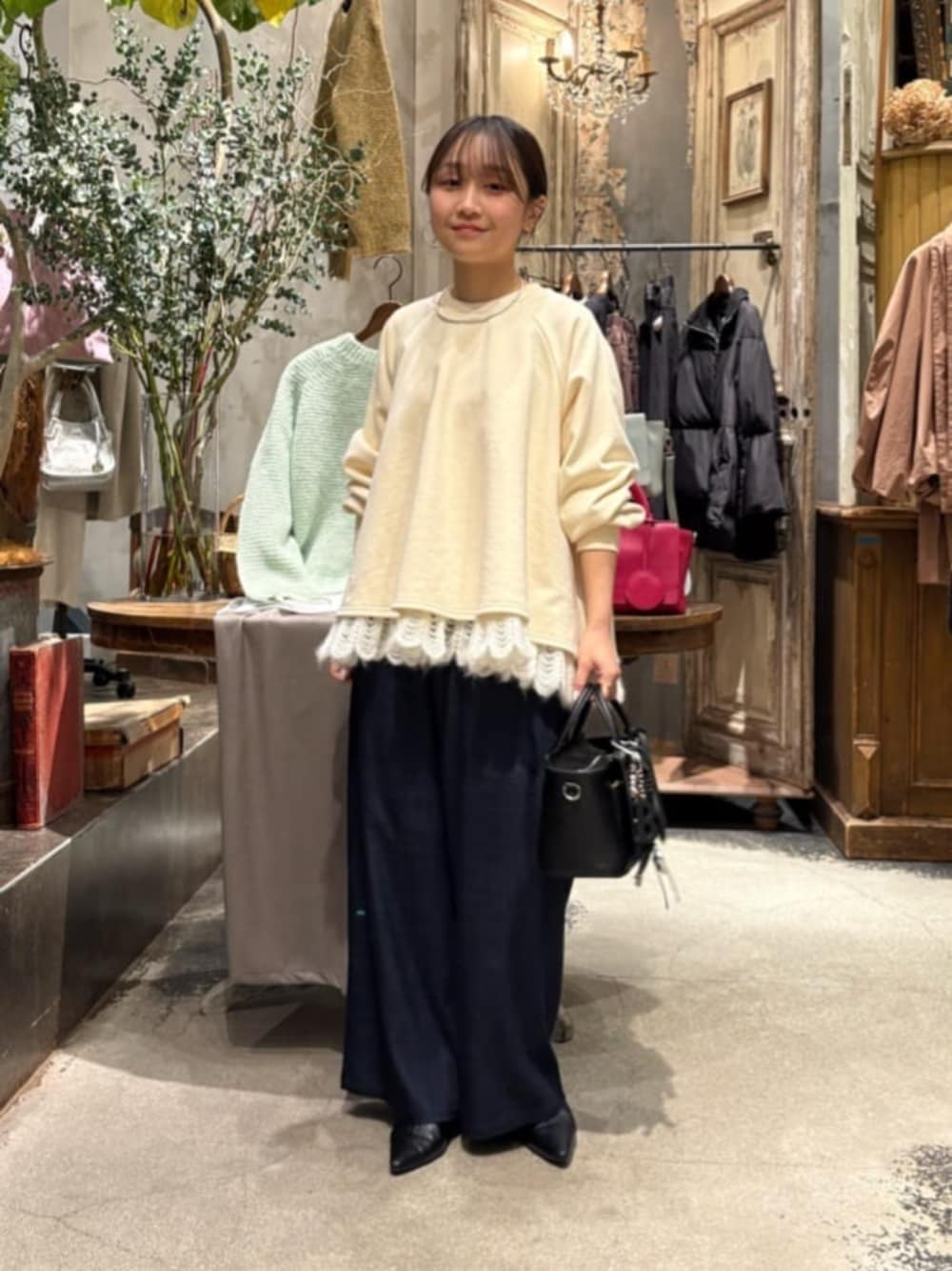 【トップス】 裾にタム糸を使用した透かし編みのニットレースをあしらったカットソー。 一枚で重ね着風のコーデが完成します。 厚すぎない生地とラグランスリーブのデザインでスッキリと着られます。 着丈も長すぎないので低身長でもワイドパンツやスカートと合わせられました。 【パンツ】着用サイズ:0 ビアズリーの定番ロングセラーアイテム。 ウエストが太めのリブとゴムで締め付けません。シワも気になりにくいです。 落ち感がありほんのり光沢感もあるのでカジュアルすぎずお召しいただけます。 149cmでくるぶし下くらいの着丈。