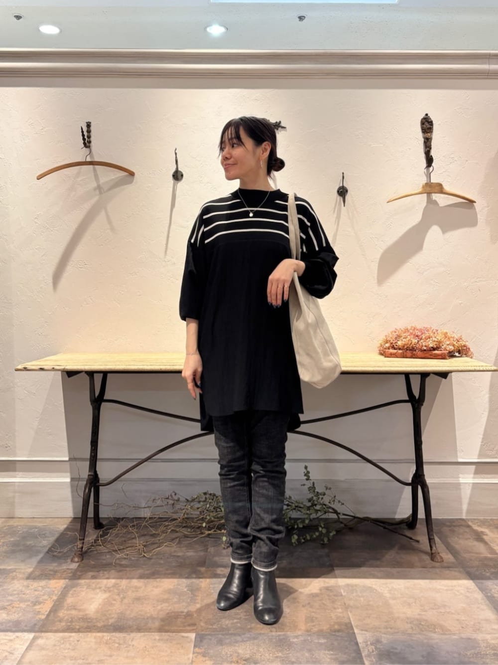 【ボーダーニットブラウス】 着用サイズ:F ニットとブラウス素材を組み合わせた ボーダーニットブラウス 衿元から胸にかけては サラサラとしたニット素材を使用し 胸下からの切替は 軽やかなブラウス生地を使用 シンプルながらも一枚で着映えします 【デニムパギンス】 着用サイズ:0 ビアズリー定番のパギンス ぴったりと細身のシルエットですが 驚くほどストレッチのある素材で 窮屈感なく穿けます 程よいフィット感で 脚のラインがキレイに見えます