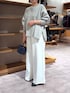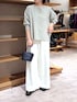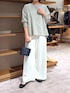 【ニット】Fサイズ 裾がややフレアで、インしなくてもワイドパンツやスカートにも合わせやすい丈。 さらりとした肌触りです。 身頃がゆったりしてますが、リブ袖や サイドのジップで(開けるとスリットが作れるので)すっきりとお召しいただけます。 【パンツ】1サイズ着用 総ゴムで、お紐で調整できるドロストパンツ。 お生地が厚すぎないので、春まで着られます。 【シューズ】 踵にゴムが入っていて、軽く踵にかかってくれるのでぬげにくいです。 【バッグ】《dragon》 ベルギーのレザーブランド。 イントレチャートと呼ばれるレザーを編み込む手法で、ハンドクラフトの美しいデザインです。