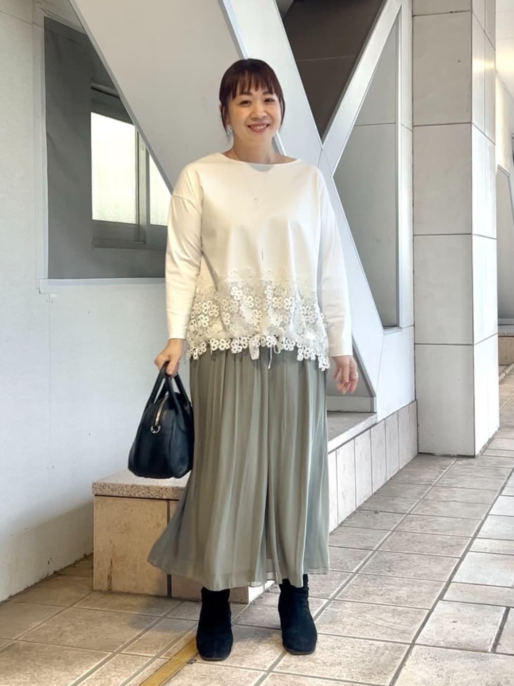 【トップス】ホワイト着用 裾の絞りと腰回りのレースがポイントのカットソーです◎ カットソーは少し伸縮性のあるので着心地も楽ちん。繊細なレースとの組み合わせはカジュアル過ぎず合わせられますよ。 裾のリボンは絞り具合を調整できるのでシルエットに変化も出せます。 パンツやスカートなどボトムも選ばないので幅広いコーディネートが楽しめますよ。 【パンツ】1サイズ/カーキ着用 スカートの様に柔らかくて軽いですが、なんとパンツなんです! 透け感のある柔らかなシフォン素材をたっぷりと使用したギャザーパンツです。 スカートのようなデザインで女性らしくフェミニンに。 ウエストはゴム仕様で着脱も楽ちんですよ。シワも気にならないので旅行にもオススメです。 シーズンレスで履けるので色々着回しも楽しめます◎ 【バッグ】ブラック着用 コロンとしたフォルムが可愛いミニバッグ。 見た目以上の収納力でペットボトルも入ります (横に収納) 両面には外ポケットもついており、スマホや鍵などすぐに取り出したいものなど、出し入れも楽ちん! ショルダーベルト付きで2way仕様になってます◎