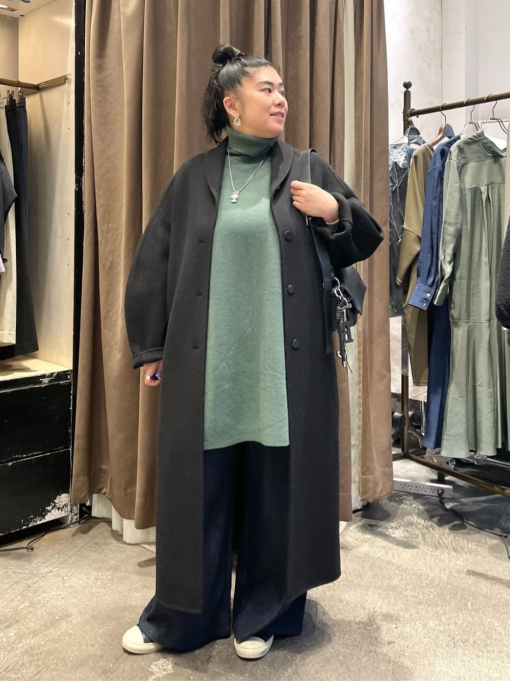 【coat】 着用サイズ : F 韓国ブランド「RRACE」のショールカラーロングコート。 上品なウール素材のリバーコートで裏地が無いので軽い仕上がりです。 私は外してポケットに入れてますが、共布のリボンが後ろウエスト部分に通っており、前で結んだり、絞ってシルエットを替えられます。 洗濯 : ドライクリーニング 伸縮性 : なし 裏地 : なし 【knit】 着用サイズ: F 人気のBIGニット。 首元も暖かく、これからの季節にオススメです。 ゆったりとしたシルエットで体のラインも拾わずに着られます。 洗濯 :ドライクリーニング 伸縮性:あり 透け感:なし 裏地 :なし 【pants】 着用サイズ : 3 ビアズリー人気のウエストリブパンツ。 新しいサイズ“3”が登場。 166cmの私は今までのサイズだと丈が足りなかったのですが、今回はフルレングスで履けました。 また、腰回りも今までよりも余裕があります。 洗濯 : 手洗い可 伸縮性 : ウエスト部分のみあり 裏地 : なし