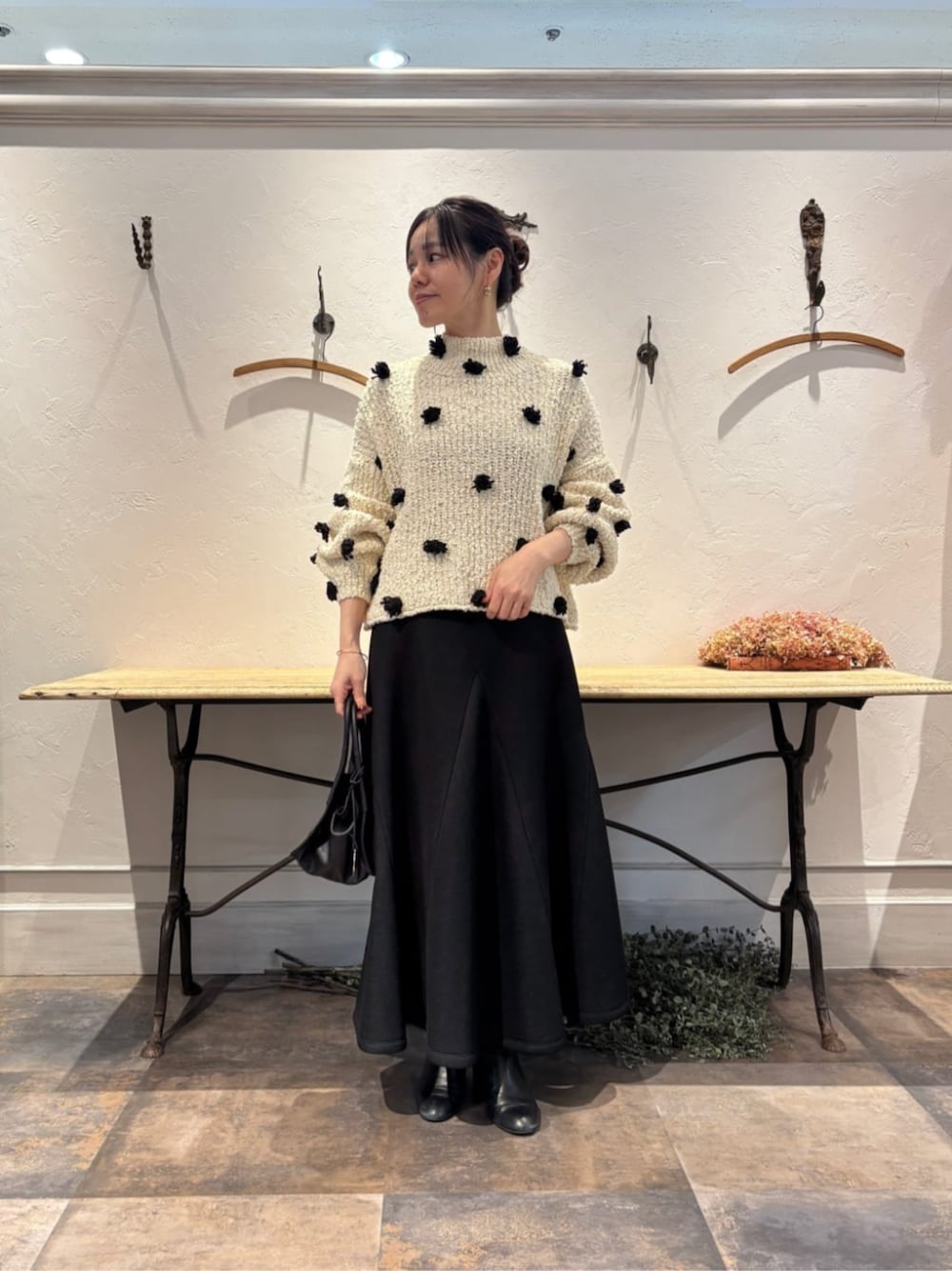【ぽんぽんドットニット】 着用サイズ:F 立体的なポンポンが大人かわいい ドットニット 凹凸のあるスラブヤーンを使用し ラフな表情に仕上げています 衿元はボトルネック コンパクトな着丈なので 低身長の方でもバランスのとりやすい コットン100%なので ウールのチクチクが 苦手な方にもおすすめ! ご自宅でお手入れできて ロングシーズン着られるアイテム 【杢ダンボールマーメイドスカート】 着用サイズ:F 大胆なカッティングと 素材感が魅力のミドル丈スカート ハリのあるダンボール素材で 立体的なマーメイドシルエットを表現 ダンボール素材ですが 軽やかな透け感があり 足元が重くならないような カジュアルな雰囲気に 裏地がついているので 透け感は気になりません◎ 裾が足に纏わりつかないので シルエットが綺麗にみえるのも 嬉しいポイントです