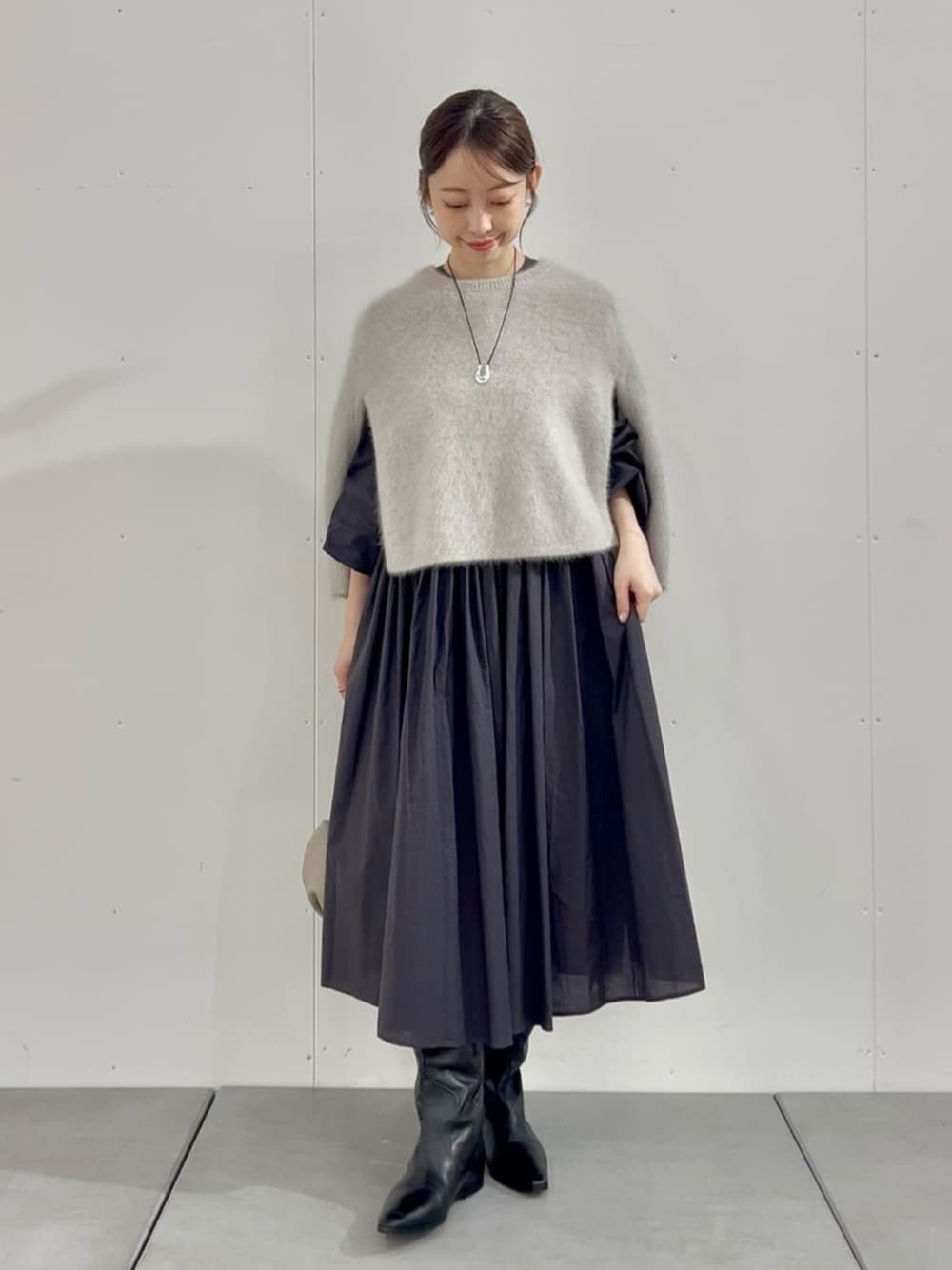 【ワンピース】着用:ネイビー・0サイズ 身幅はゆったりしていますが、山なりギャザーなので 横に広がりすぎず、スッキリ着られます◎ 154cmで、0サイズを着用し拗ね辺りの丈感。 1枚はもちろん、ベストやニットを重ねても素敵です。 【ポンチョ】着用サイズ:F 柔らかい肌触りで軽く、暖かいです。 1枚重ねるだけで、普段のコーディネートが ワンランクアップしますよ。 手洗いできるのも嬉しいポイントです◎