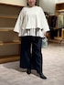 【トップス】 スエットとブラウスがセットです。 別々にも着れるのでコーディネートの幅が広がります。 (スエット) オーバーサイズで中に重ね着を楽しめます。 お袖や身幅はゆったりしてます。 着丈は短めです。 身体のライン拾わずに着れました。 (インナー) Aラインのブラウスです。 裾にランダムに切り替えがあるので動きがでます。 伸縮性はないので、私は少し二の腕がキツく感じました。 腰まわりカバーしてくれる着丈です。 【ボトム】 2サイズ着用 ウエストがリブになっていて、ゴムの所を折り返して着るとお靴やトップスの着丈によって変えれるのが魅力です。 お腹とお尻がとにかく楽なんです! 秘密は、股上が長めなので私のようにポッコリお腹やヒップが出ている方におすすめなんです♩ リピ買いしてしまうほど楽ちんですよ!