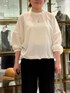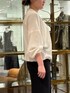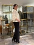 【ブラウス】着用サイズ:F シワになりにくい、プルオーバーブラウス。 上品な印象でオケージョンにも活躍します! 後ろ衿元にはファスナー付きで着脱がスムーズです。 裾のリボンを結ぶと、ふんわりとした丸みのあるシルエットになり、インしなくてもスッキリ着用できます◎ 袖口はゴム仕様で、袖をたくし上げやすいデザインです。 165cmの私は、Fサイズ着用でお尻に少しかかる丈感です。 【パンツ】着用サイズ:F 上品なジョーゼット素材のロングパンツ。 センタープレス入りで、品よく着用していただけます。 フロント部分はファスナーやボタンを無くし、フェイク仕様になっていて着脱も楽です! 後ろウエストゴム仕様で伸縮性があるのでお腹周りの締め付けも気にならないデザインです◎ 165cmの私はFサイズ着用で、足首にかかる丈感です。