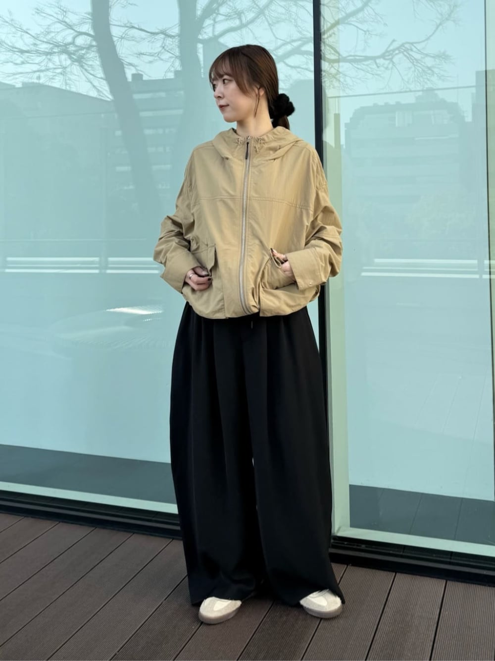 フード付きのマウンテンパーカーで ゆるっとカジュアルなコーディネート。 軽くて普段使いしやすいラフなデザインです。 さらっと着るだけでおしゃれに見えるし 大きめなシルエットなので、 中に厚手なスウェットも来ていただける安心のサイズ感。 ファスナーはダブルジップ仕様なので下を開けて ワイドのタックパンツと合わせました✳︎