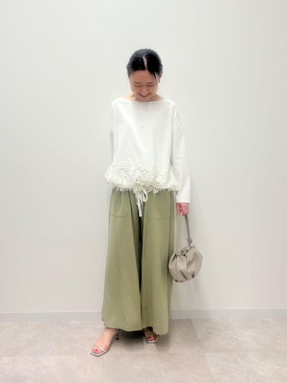 【裾レースカットソー】 毎回大人気の ビアズリーの名品! 裾の紐を調整して絞ると ウエスト周りが小さくなって 低身長さんでも バランス良く着ていただけます。 【ジャージーワイドパンツ】 0(S)サイズ着用 幅がゆったりあるので キュロットのような雰囲気にも見えるパンツ。 着丈は、ウエスト紐で 調整できるようになっています。 目新しいワイドパンツ。