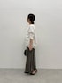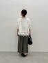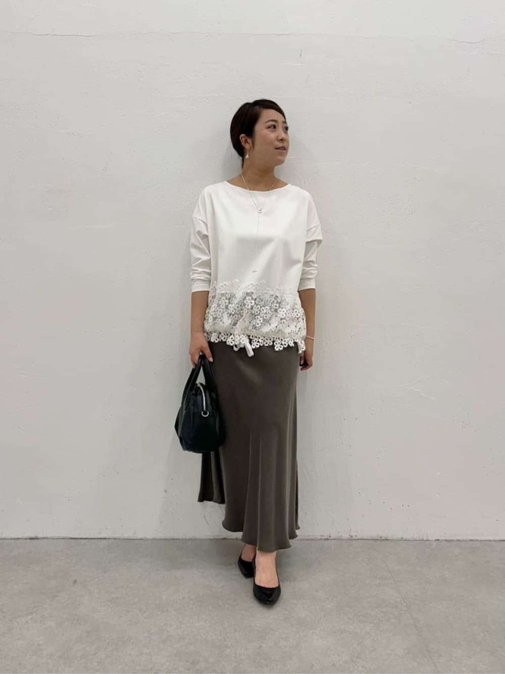 【トップス】着用サイズ:F 滑らかな生地で、伸縮性も高いカットソー。 裾には紐が一周通っており、 絞り具合でシルエットを調整できます。 前は骨盤が隠れ、後ろはヒップが隠れる着丈です。 裾を絞れることもあり、 細身のパンツからフレアスカートまで 合わせられるボトムの種類が多いです。 首に圧迫感が出やすい骨格なので、 襟ぐりが横に広く開くことですっきり見えるところも 個人的に嬉しいポイントです。 袖口は たくし上げると留まるほどのすっきり具合ですが、 肩の切り替えは落ちているため、 二の腕のカバーができるところも嬉しいです。 【スカート】着用サイズ:0(2サイズで小さい方) ストンと落ちる生地で すっきりとしたシルエットです。 153cmの私が履くと、 ショートブーツを合わせてたときに裾が被らないくらいの丈です。 タイトスカートよりは ヒップや太もものラインが気になりにくく、 すっきり見えるので愛用しています。 ヒップ大きさと太ももの厚みが気になる私は ショート丈のものより、 着用しているトップスほどの丈のあるもので 合わせることが多いです。 特にフレアスカートを履くことが多い私は、 ロングアウターやゆったりめのニットを着たときに 全体のバランスをすっきり見せたいと思うことが多いので、 このスカートがあることで、 ニットやアウターなどの着回しの幅が広がりました。