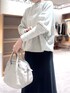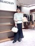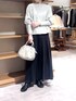【ニット】Fサイズ きれいめに着られるハイゲージのウールニット。 薄手なので、暑がりさんや、暖房の効いた場所での着用、ダウンジャケットのインナーなどにおすすめです! 裾にゴムが通してあり、くるんと丸まってくれるので、ボトムにインしなくてもブラウジングが簡単にできます。 【スカート】1サイズ着用 ウエストは総ゴム(紐で調節もできます)で楽ちん。ヒップ周りが広がらず、するんと落ちて細く見える名品スカートです! 後ろのタック(しっぽのような)で、可動域を広げて歩きやすく、歩くとひらひらとエレガントな動きが出るシルエット。 【ジャケット】Fサイズ ダウン80%フェザー20%で軽くてとても暖かい! 後ろ下がりでヒップは隠れますが、長すぎないので車移動や旅行にもおすすめです。 襟元が上までジップが閉まるので、ネック周りも暖かいです。 【バッグ】 大きすぎず小さすぎずの、絶妙なサイズ感が使い勝手の良いボストンバッグ。 シボ入りのレザーで、傷が目立ちにくいです。 マチがしっかりあるので、身の回りの荷物がたくさん入って大きすぎないので、旅行にもおすすめ。 ショルダーのストラップの長さが細かく調整できるので、肩がけでも斜めがけでもお使いいただけます。