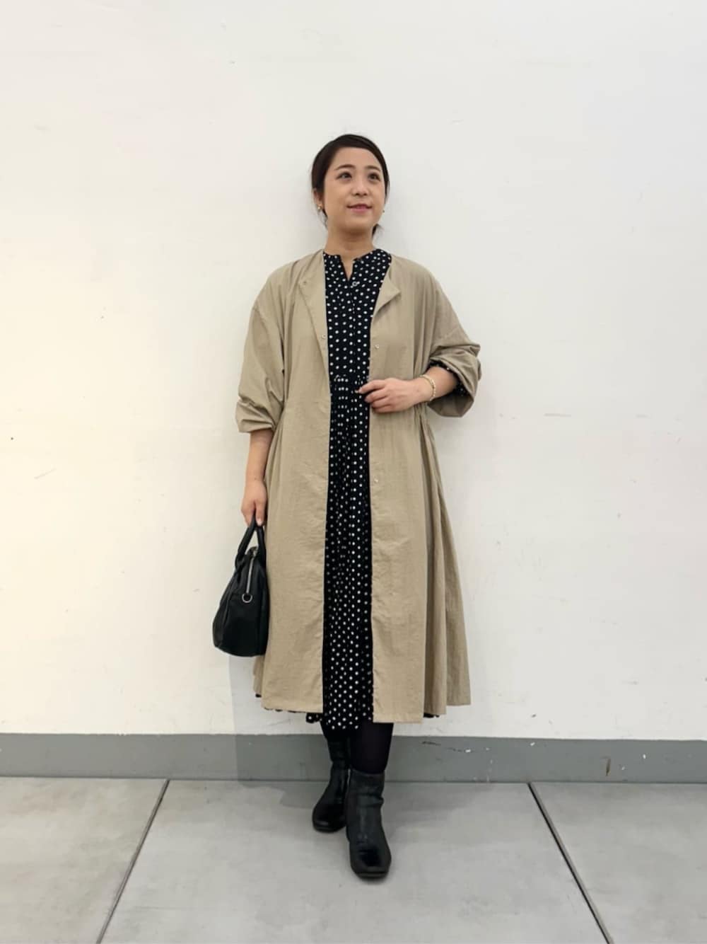 【アウター】着用サイズ:F 季節の変わり目に重宝する、薄手のアウターです。 ノーカラーなので、首元はすっきり見えます。 フード付きのトップスや タートルネックを合わせやすいので、 着回しに困らないところも嬉しいです。 袖や身幅はゆったりしているので、 中に着るもののボリュームや厚さを気にせず着られます。 153cmの私が着るとスネくらいまでで、 ショートブーツを合わせても肌が見える着丈です。 【ワンピース】着用サイズ:0 0,1,2の3サイズになって再登場した 大人気のドットギャザーワンピ。 たっぷり入ったギャザーのおかげで、 お腹やヒップ周りのボディラインをカバーできます。 153cmの私が着るとスネくらいまでの着丈で、 ショートブーツを合わせても肌が見えます。 袖口にはゴムが入っており、手首を出すことで すっきり見えるところも嬉しいです。 凹凸があるシボ感の薄めの生地なので、 季節を問わず着られます。 写真ではタイツにショートブーツですが、 暑いときはタイツ無しでフラットシューズや パンプスで合わせても素敵です。