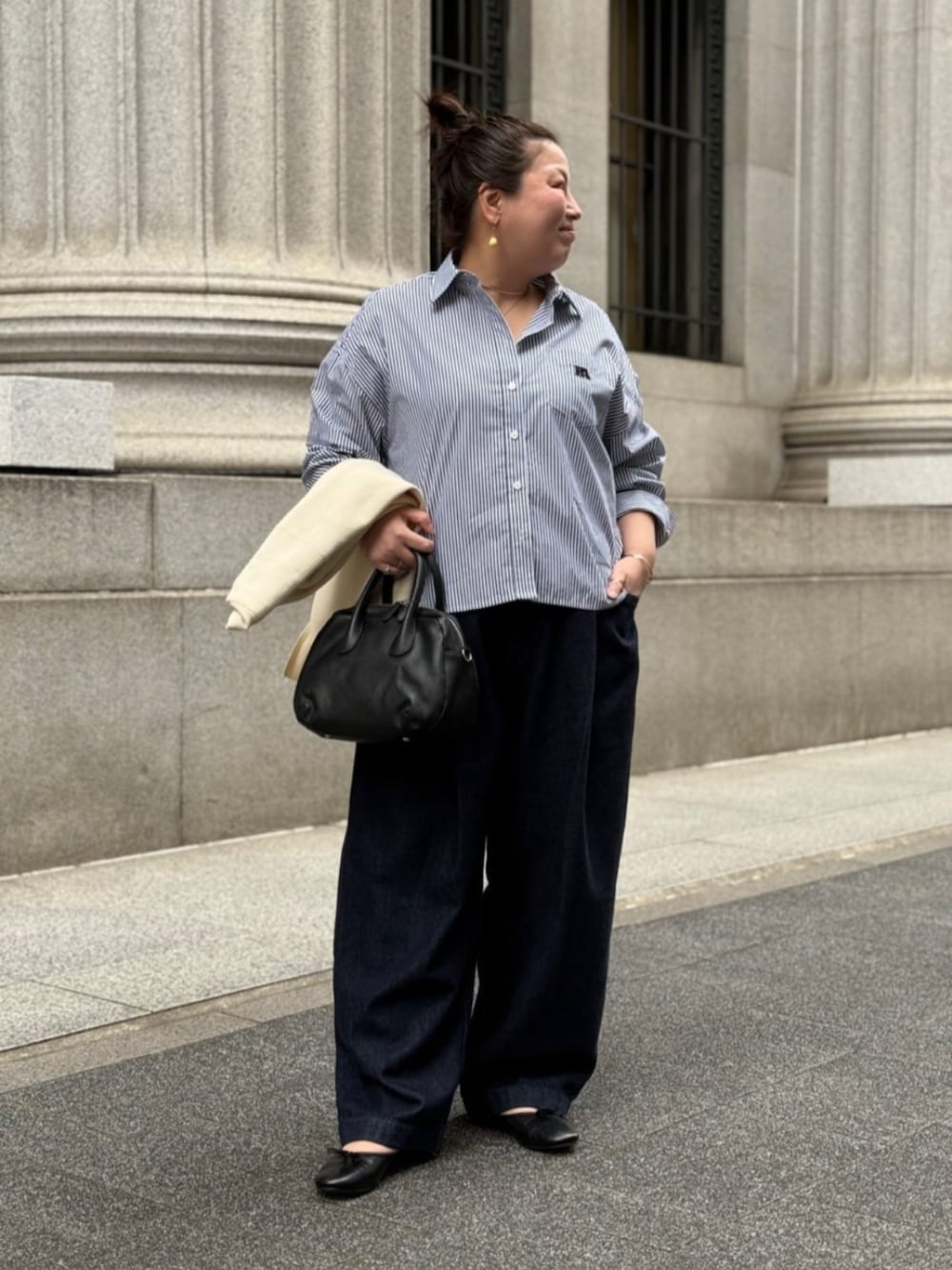 【シャツ】 ぽっちゃりの私でもボタンがしっかりととめれました! 私はクビが短いのでボタンを開けて着るのが好き。 ショート丈ですが、腰まわりはカバーしてくれるのですっきり着れました!! お袖も余裕あるので着やすいです。 【デニム】私のコラボデニムです😊✨ こんなデニムが欲しかった!!が沢山詰まってます✨✨✨ ホワイトデニムは透け感が気にならなくて お尻だしても安心でした👍✨✨✨嬉しい❤️ ウエストが楽ちん! 後ろにゴムが入っていて着心地良いです。 ストレッチが効いてないですが、タックを深めに作っているので、お腹周りや太ももをスッキリ見せてくれます💁♀️ ワイドですが、裾になるにつれてスッキリするようにデザインしているのでライン拾わず履けますよ。 お尻もゆとりあるので下着ライン気にならないです🤭 座ってもお腹苦しくなくて、穿いたままお昼寝できちゃうぐらい楽ちんです🤭 2サイズはウエストかなり大きめのデザインなので ベルトでキュッと閉めてくださいね。