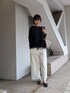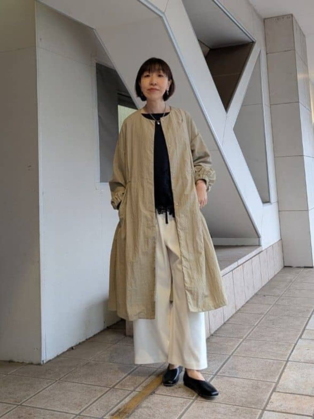 【トップス】 サラサラっとした質感で、伸縮性もある生地。 身幅も袖幅とゆったりしていて着やすいです。 首開きはボートネックで、横にやや広め。お顔がスッキリした印象に。 後ろはヒップがしっかり隠れる着丈、 1枚で華やかな印象になり、アラフィフ以上の方におすすめです。 【パンツ】1サイズ着用 表地はサラッとした質感で、夏以外3シーズン使える素材です。お仕事のシーンや、きちんとした場面にも便利です。 裏はほんのり微起毛になっていて優しい肌当たり。 ウエストは柔らかいゴムになっており、ストレスフリーな履き心地です。 164cmでくるぶしくらいのすっきりした着丈になります。 【コート】 ナイロン素材でとっても軽く、シワも気にせず気軽に羽織れます。 ノーカラーで前がスッキリしているので、どんなスタイリングにも合わせやすいのが魅力です。 身長体型問わず、どんなシーンにも使いやすい着回し力の高いデザインです。 折り畳んで持ち歩きにも◎ 自宅洗い可能なのも嬉しいポイント! 【バッグ】 小さすぎず、大きすぎず、必要最低限のものがしっかり入る見た目以上の容量の多さが人気の理由です! キズの目立たない質感のレザー、そしてどんな場面でも使えるシンプルなデザインなので、1つあれば大活躍すること間違いなしですよ。