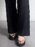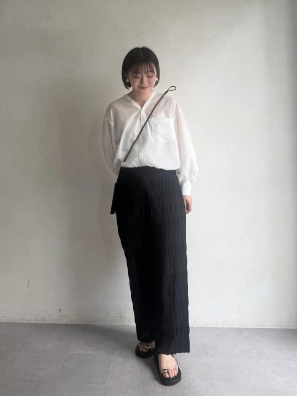【トップス】Fサイズ着用 透け感のある柔らかな生地で、女性らしさのあるシャツ。 ゆったりとしたシルエットで、普段使いにも◎ Vネックのデザインで顔周りをすっきりとした印象に。 ボタンを開けて羽織りにもでき、 日差し避けや冷房対策にもなるのが嬉しいポイント。 【サンダル】38サイズ 親指のデザインリングがアクセントになったサンダル。 厚みのあるインソールで、 足にフィットし疲れにくさを軽減してくれます。 かかと部分にストラップ、 甲部分にファスナーがついているので 着脱もしやすいです。