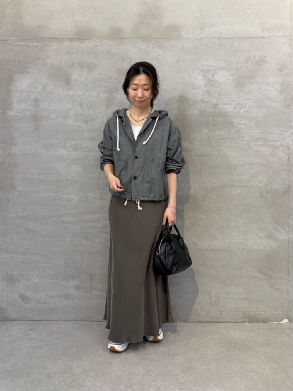 【トップス】 綿100%の程よくハリのあるシャツ素材が くだけすぎないコーディネートに仕上げてくれるシャツフーディー。 コンパクトな着丈なのでもたつかずにすっきりとした印象に。 裾の絞り具合を調整してシルエットを変えられるのが嬉しいです。 【スカート】1サイズ着用 とろみのある生地のバックテールスカートは、綺麗な動きがでて女性らしい。 マーメイドシルエットが脚のラインを綺麗に見せてくれます。ゴムウエストで快適です。