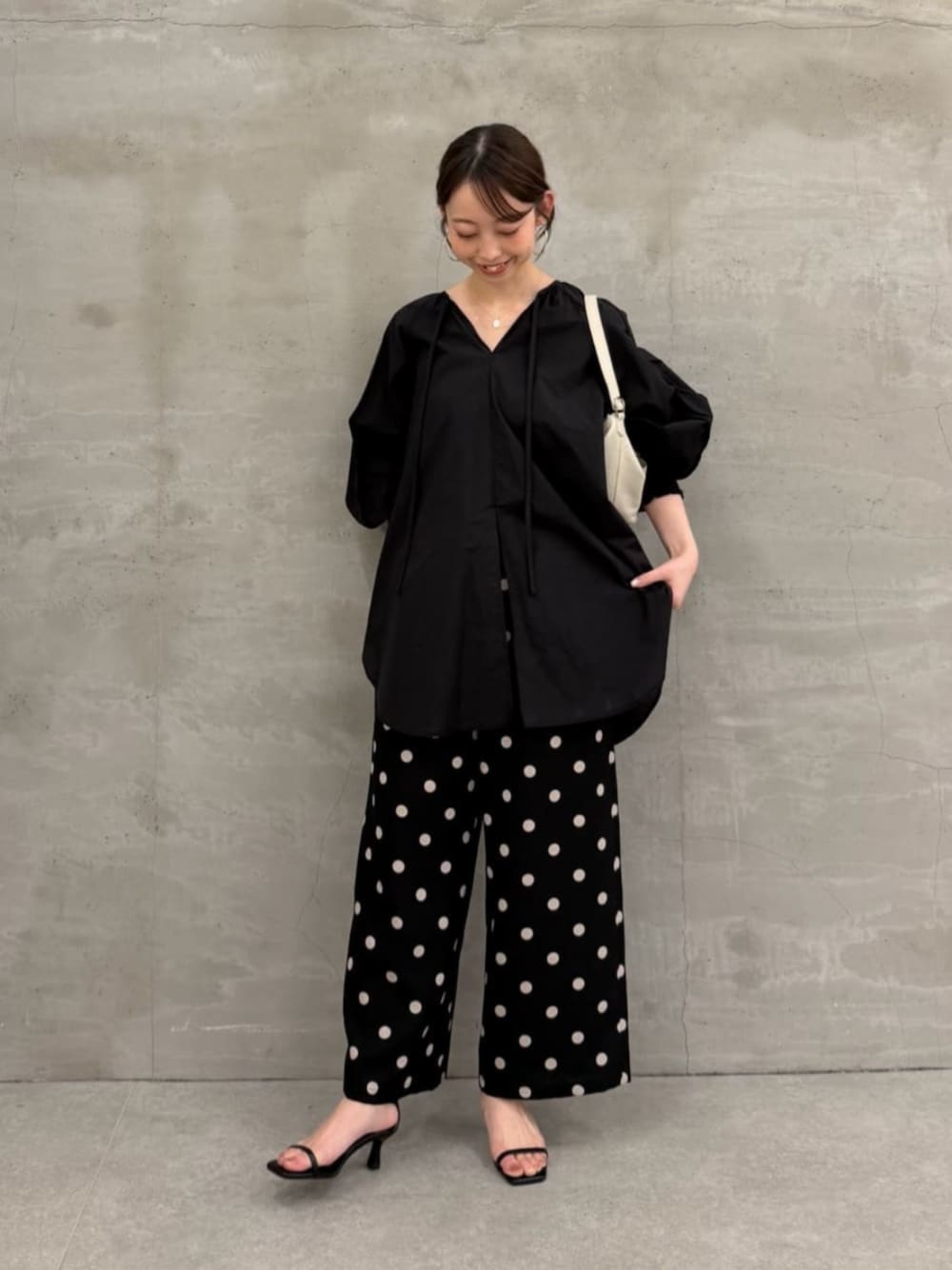 【ブラウス】着用サイズ:F 軽やかな透け感が魅力のシアーブラウス。 チュニック丈ですが、サイドとフロントにはスリットが入っているので、抜け感が出ます◎ 154cmでヒップがすっぽり隠れる丈感。 【パンツ】着用サイズ:0 ドットプリントがコーディネートのアクセントになるパンツ。 軽やかなポリエステル100%素材を使用し、シワになりにくいのも嬉しいポイント◎ 154cmで0サイズを着用し、くるぶしちょうどの丈感。