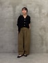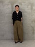 【トップス】 シアーのブラウス素材を使用したカーディガン。袖口がリブなのでまくっても落ちてこなく、低身長でもバランスが取りやすいです。 着丈はヒップが隠れるくらいです。 【パンツ】着用サイズ:0 独特な加工をしたナチュラルな風合いが魅力のパンツ。バレルシルエットが旬な雰囲気を演出します。 149cmで素足ではいて床につくかつかないかくらいの着丈なので、靴をはいてちょうどいいくらいだと思いました。ウエストもゴムなのでベルトなしでも綺麗に着用できました。