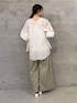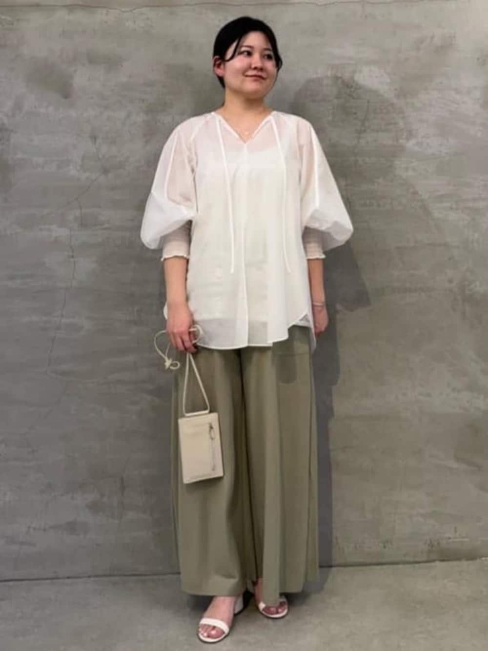 【ブラウス】着用サイズ:F 立体的なドルマンスリーブが素敵なシアーブラウス。 手首のリブの部分が長く腕をまくるだけでふわっと可愛いお袖になります。 リブの締め付けは気にならなかったです◎ ふわっとした雰囲気ですが、首元が開いているのと横にスリットが入っているので骨ストの私でもスッキリ着用できました! 165cmの私は、Fサイズ着用でお尻がしっかり隠れる丈感です。 【インナー】着用サイズ:F 取り入れるだけで華やかさをプラスしてくれるレースキャミソールです。 シャツや羽織、ベストのインナーとして着用するとレースがチラッと見えて可愛いです! 165cmの私は、Fサイズ着用でお尻にかかる丈感です。 【パンツ】着用サイズ:2 薄手でシボ感のあるストレッチジャージー素材を使用したワイドパンツ。 裾に向かって緩やかに広がるシルエットで、ジャージー素材ですがラフになりすぎず、すっきりとした印象で着用していただけます。 ウエストはゴム仕様に加え、ヒモでサイズ調整が可能なため、ストレスフリーな穿き心地です◎ 165cmの私は、2サイズ着用で足首が隠れる丈感です。
