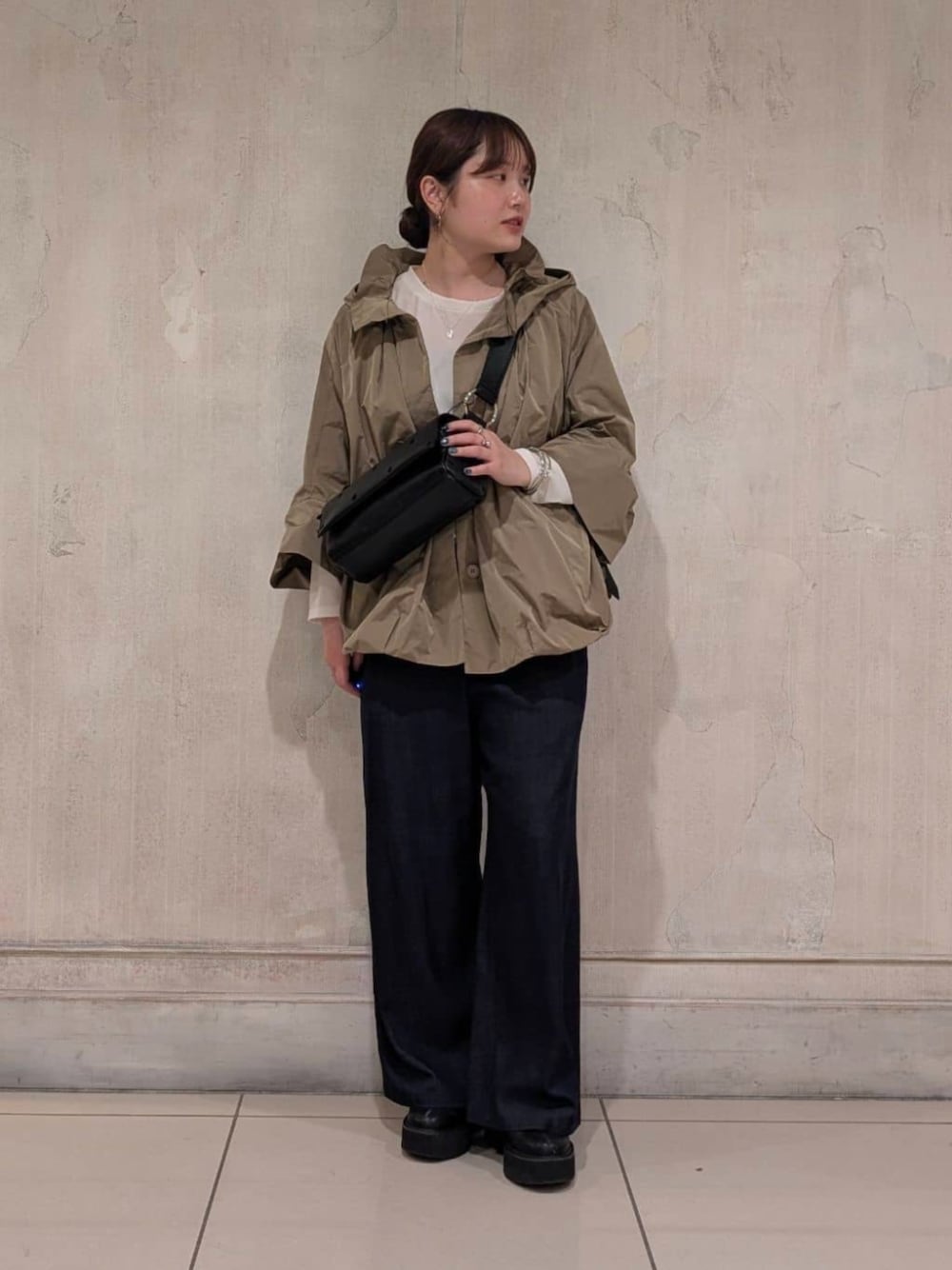 【インナー】 カラー:ホワイト サイズ:1 どんなトップスでもレイヤードできる綺麗めブラウス。 薄手の生地なので着膨れなく 重ね着をお楽しみいただけます。 伸縮性があり、お手洗い洗濯もできるので デイリー使いにピッタリ。 少し長めの丈なので腰回りをカバーしながら、 レイヤードを楽しめるブラウスです。 手洗い可◎ 【アウター】カラー:ベージュ ありそうで他にはないデザインが特徴の ビアズリー大人気アウター。 バルーンのような丸みのあるシルエットと、サイドのリボンによってカジュアルすぎずに着られます。 シワが気になりにくく、軽いアウターなので、 持ち運びにも◎ 裏地がしっかり付いているので、冬の終わりから 秋の終わりまで長いシーズンで着られます。 【パンツ】 カラー: インディゴ サイズ:TM ウエストリブなのでお腹や腰回りが ゆったりしており、 楽ちんに穿けます。 光沢感があるのでいつもデニムで 合わせているコーデに、 このパンツを合わせるだけで綺麗めコーデに! 私は新しく展開されたTMサイズを穿いています。 普段少しパンツが短くなってしまう方や、 私と同じ、少し長めに穿きたいなと考える方は こちらのサイズがオススメです!! 手洗い可◎