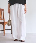 【ブラウス】 首開きすっきり、シンプルなデザインなので1枚でももちろん、羽織りのインナーにしやすいです。 明るすぎず暗すぎずのブルーなので、普段色を着慣れない方にも安心して着られるトーンだと思いました。 裾の紐で着丈調整できるところも使いやすいポイントです。 生地感も薄すぎず汗ジミの心配もなさそう。 【パンツ】2サイズ着用 トレンド感のあるバレルシルエットは、穿くだけでオシャレな雰囲気に。 特殊な加工がされたナチュラルな風合いで、綿100%なのにハリッとした肌離れのよい穿き心地でした。 164cmで2サイズは、フラットシューズだと床に着くすれすれの長さでした。厚底の靴やヒールで合わせると脚長効果抜群。 フラットシューズには1サイズがちょうど良さそうです。
