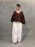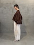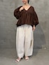 【トップス】着用サイズ:F 身幅のたっぷりとしたギャザーが魅力のVネックブラウス。 袖にもギャザーを施し、袖をまくることでバルーンスリーブのようなボリューム感を楽しめます◎ フロントボタンは開閉可能なので、羽織としても使っていただけます。 【パンツ】着用サイズ:0 立体的なシルエットが魅力で、穿くだけでオシャレ見えするバレルパンツ。 綿100%ですが、程よいハリ感は残しつつ、柔らかさもある穿きやすい生地感。 154cmで0サイズを着用し、フラットシューズだと床につかないくらいの長めの丈感。