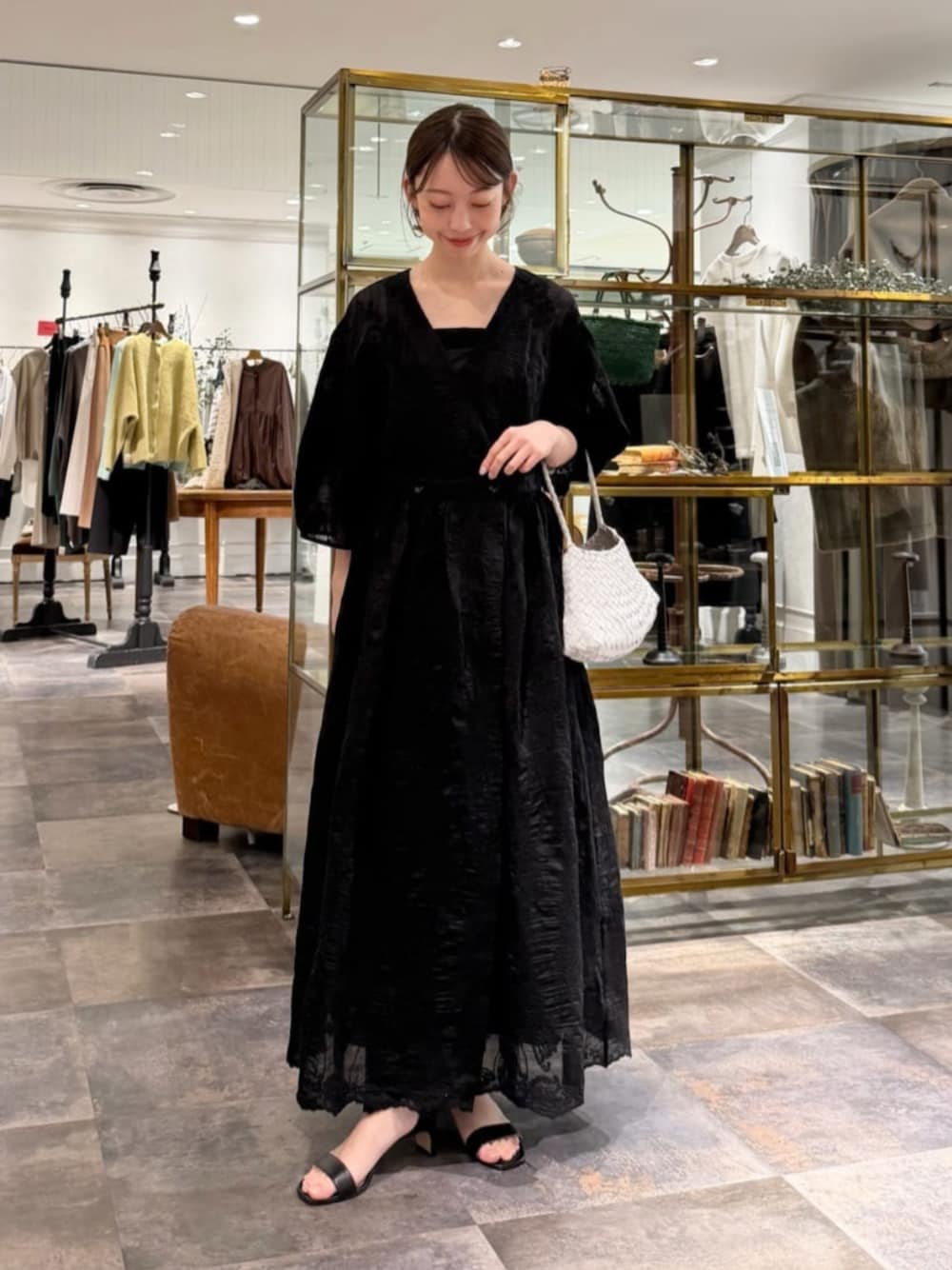 【ワンピース】着用サイズ:F 薄手でハリのある素材に、ペイズリー柄をミシンステッチで表現したクラフト感あふれる一着。 フロントは合わせ仕様で、ボタンを留めればワンピースとして、開ければ軽い羽織としても着用可能◎ 程よい透け感があり、インナーキャミソール付きで安心です。 154cmでくるぶしにかかる丈感。