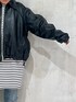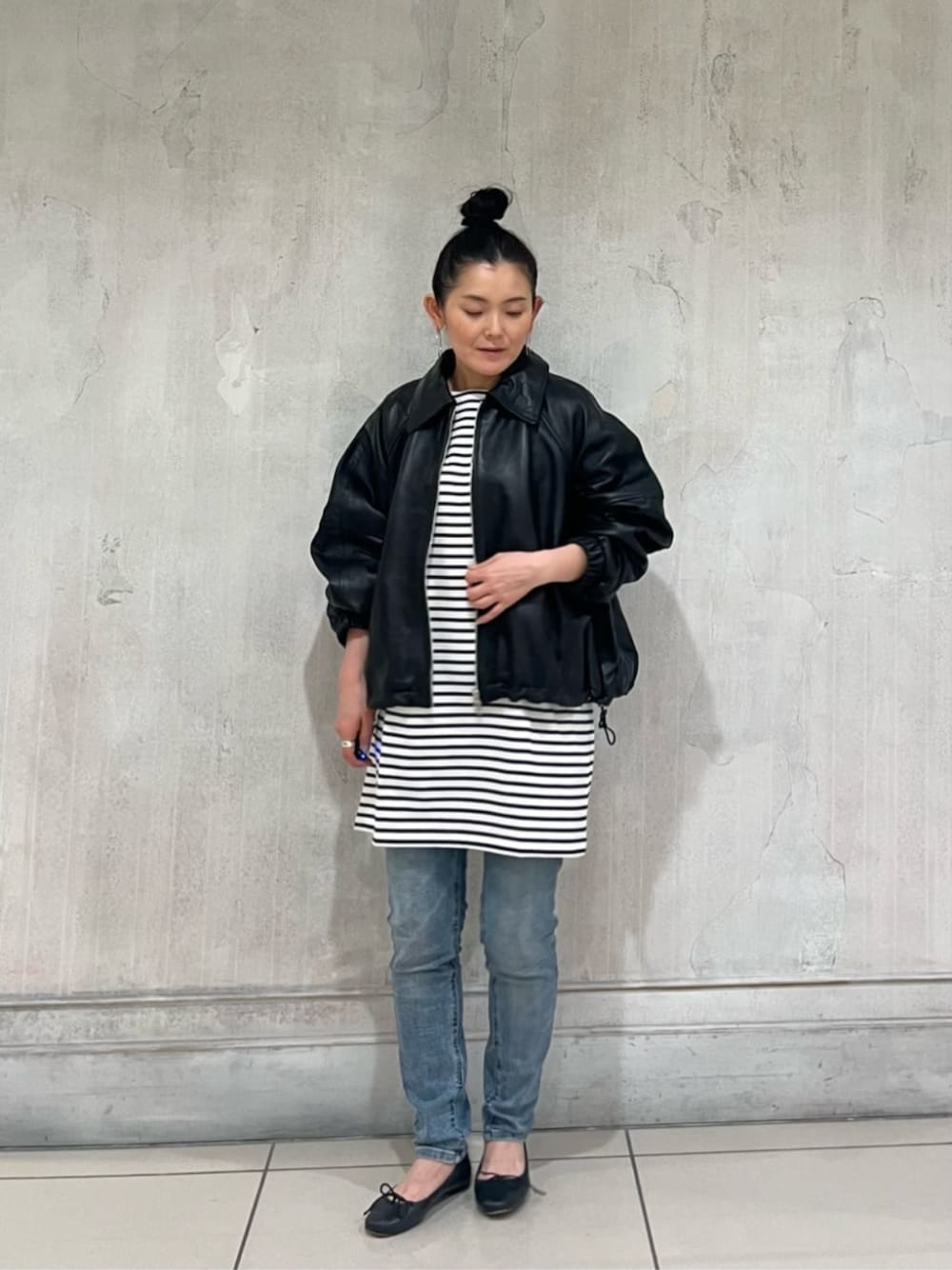 【blouson】着用サイズ F size スッキリ丈のレザーブルゾン 裾の絞りでギャザーを調節できるので スカートスタイルやワンピースなど さまざまなスタイルにコーディネートしやすいデザイン 手首がゴムなのも腕まくりしやすい 嬉しいポイント 今年の春には揃えておきたい レザージャケットです。