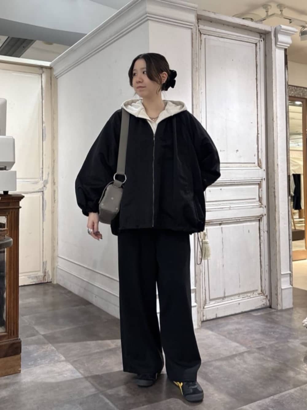 【parker】 着用サイズ:F 裾がドローコードで絞れるパーカー。 首元はジップで調節可能で、開けてすっきり見えします◎ 厚すぎない生地感で、秋から春にかけて着ていただけます。 洗濯:手洗い可 伸縮性:なし 透け感:なし 裏地:なし 【blouson】 着用サイズ:F 襟元、袖口、裾にギャザーが入ったブルゾン。 たっぷりな見頃で、中にも着込めて体のラインも拾わない。 裏地もあるので、季節の変わり目にぴったりです! 洗濯:ドライクリーニング 伸縮性:なし 透け感:なし 裏地:あり 【pants】 着用サイズ:1 美シルエットのワイドパンツ。 ウエストはぐるっと1周ゴムなので楽に穿いていただけます。 ワイドシルエットですが、ストンと落ちるのでダボッとしないのもポイント◎ 158cm、1サイズがぴったりでした! 洗濯:手洗い可 伸縮性:あり 透け感:なし 裏地:なし