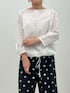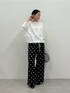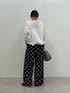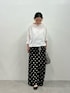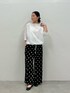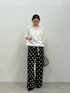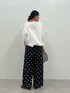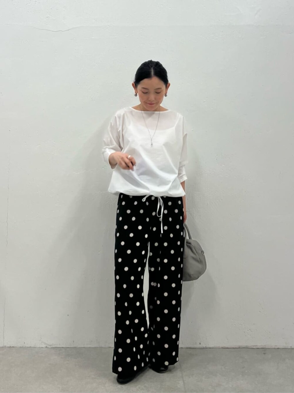 【tops】着用サイズ F size シャツ素材のTシャツのように着やすいブラウス 生地に張りがあり身体のラインを拾わない嬉しいアイテム 後ろはボタンで着脱もしやく 裾のリボンで絞って調節していただけます。 インナーとしても、初夏は一枚でシーズン長く使えるブラウスです。 【pants】着用サイズ 1size ウエスト総ゴムの楽ちんパンツ ストンとした落ち感でスッキリと穿きやすいパンツ ドット柄がいつものコーディネートを華やかにしてくれます。 凹凸のある生地で シワになりにくい生地でご旅行などにもおすすめです。