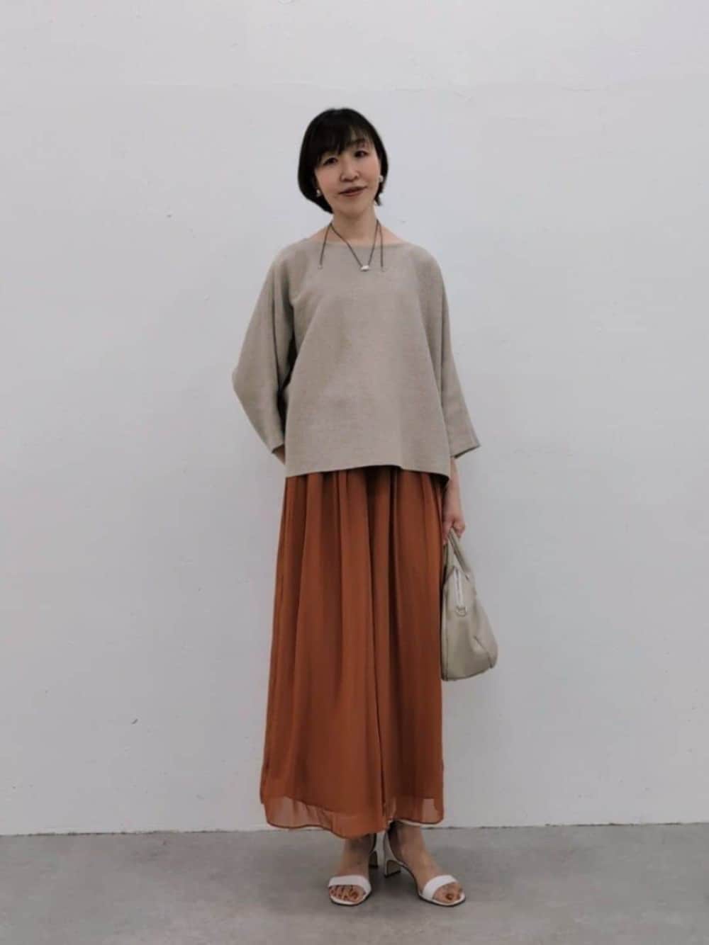 【ニット】 リネン100%ならではのサラッと気持ちの良い着心地。 インレイ編みにしてあることで、型崩れしにくくナチュラルなのにきちんと見えるところも◎ 透け感もなく安心感ありました。糸に表情があるので、シンプルなコーディネートでも雰囲気が出て素敵です! 【パンツ】2サイズ着用 スカートと変わらない穿き心地です。 オールシーズン着用でき、合わせるトップスの素材感も選ばないので1枚あると便利です。 ウエスト、ヒップはかなり広がるので、サイズは着丈のお好みで選ぶと良いと思います。 春夏は素足が覗くので、164cmの身長ですと長めの2サイズも安心感がありました。 【バッグ】 小さすぎず、大きすぎず、必要最低限のものがしっかり入る見た目以上の容量の多さが人気の理由です! キズの目立たない質感のレザー、そしてどんな場面でも使えるシンプルなデザインなので、1つあれば大活躍すること間違いなしですよ。