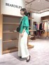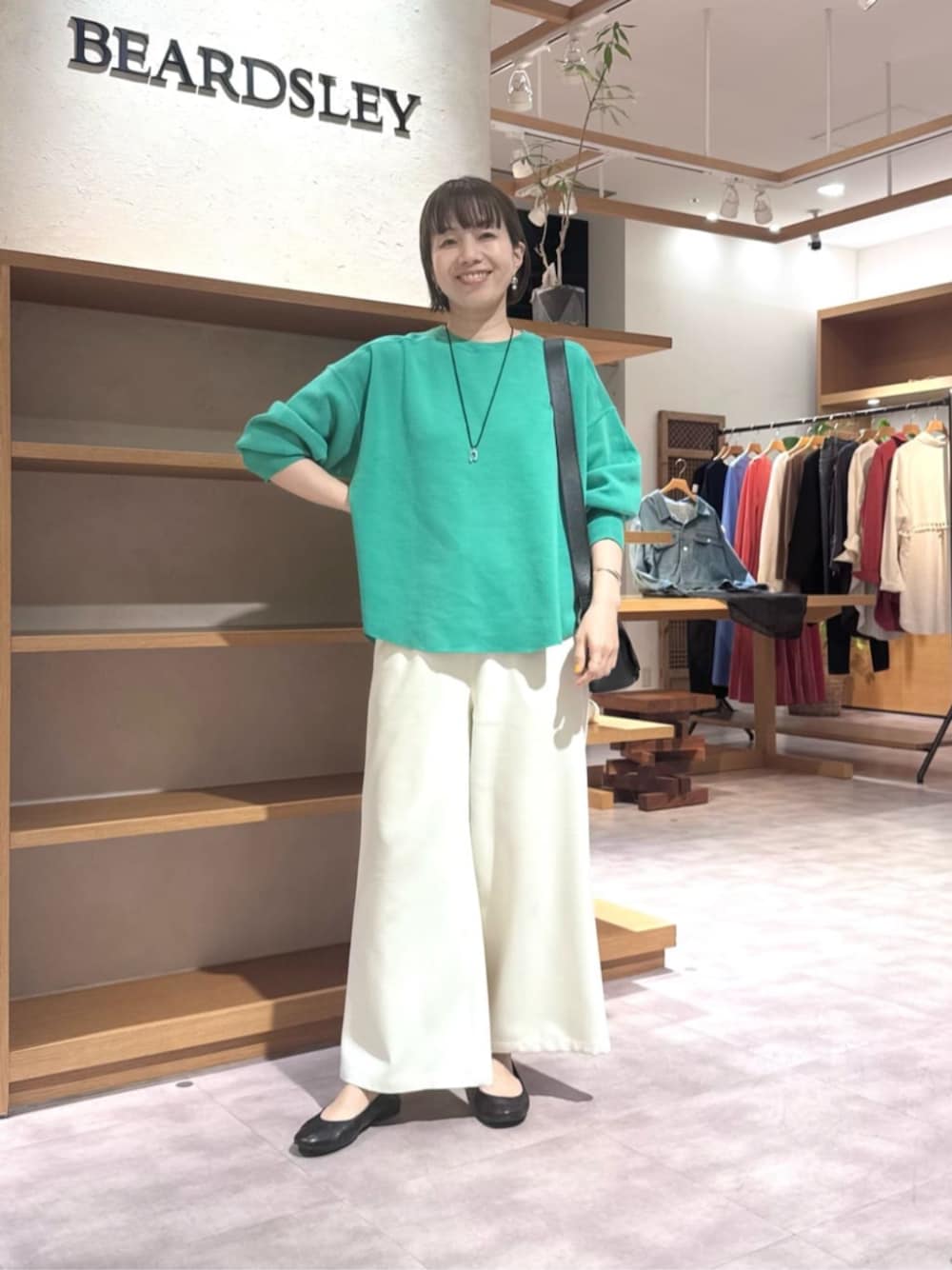 着映えするカラーは、春気分を一気に盛り上げてくれます。 【ニット】Fサイズ きれいめトレーナーのように着られるハイゲージの柔らかニット。着心地抜群です。 グリーンはきれいな発色で、トレーナー生地より肌馴染みが良いです。 【パンツ】1サイズ着用 ウエストが太めのリブと総ゴムで楽ちんなワイドパンツ。さらにリボン紐で締めることもできます。 ワイドでも落ち感が良く、広がりすぎないシルエットですっきり見えます。冬は暖かいタイツと合わせてくださいね。 【ブルゾン】Fサイズ サイドのドロストコードやジップでカジュアルな印象を持たせつつ、襟周りのギャザーでフェミニンな雰囲気も併せ持つ、オトナ女性にぴったりなブルゾン。 ヒップも隠れる丈で、小柄さんも絞り具合で丈感調整できます。 【バッグ】 上品に持てるボディバッグ。 レザーで横長のシルエットがカジュアルすぎず、きれいめコーデにも合います。 マチが広くて、ジップが端まで開くので、たくさん入って出し入れしやすいです。 ポケットが多いので仕分けもしやすいです。