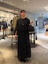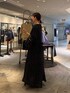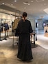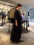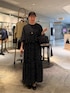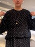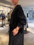 【ワンピース】Fサイズ着用 ランダムに散りばめられたドット柄が華やかなワンピース。ゆったりシルエットで体のラインも拾いにくいです。 フリルとギャザーがアクセントになっており、上品な印象に。