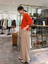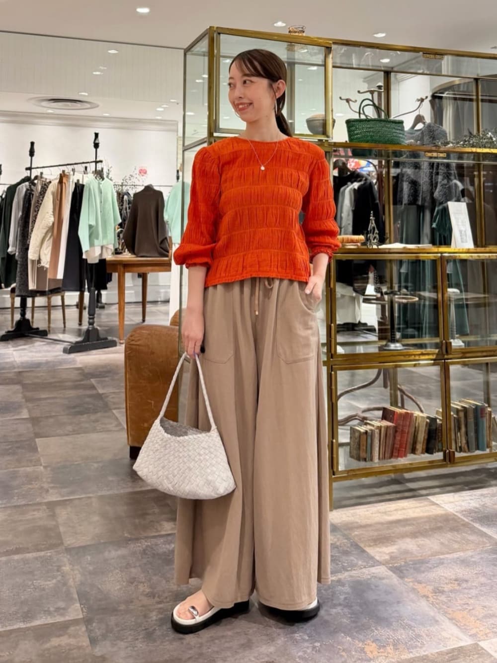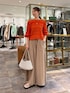 【ブラウス】着用サイズ:F 鮮やかな朱赤のようなオレンジカラーが素敵なシャーリングブラウス。 コットン100%の柔らかな生地にワッシャー加工されているので、伸縮性が高くとても着心地が良いです◎ 154cmで腰にかかる丈感なのでどんなボトムとも相性が良いです。 【パンツ】着用サイズ:0 薄手でシボ感のあるワイドパンツ。 ワイドシルエットですが、落ち感のあるデザインなので抜け感のある印象になります。 ウエストはゴム仕様で、紐付きなのでサイズ調整が可能。 ストレスフリーな穿き心地です◎ 154cmで0サイズを着用し、足の甲に少しかかる丈感。 フラットシューズでも問題なく穿けました。