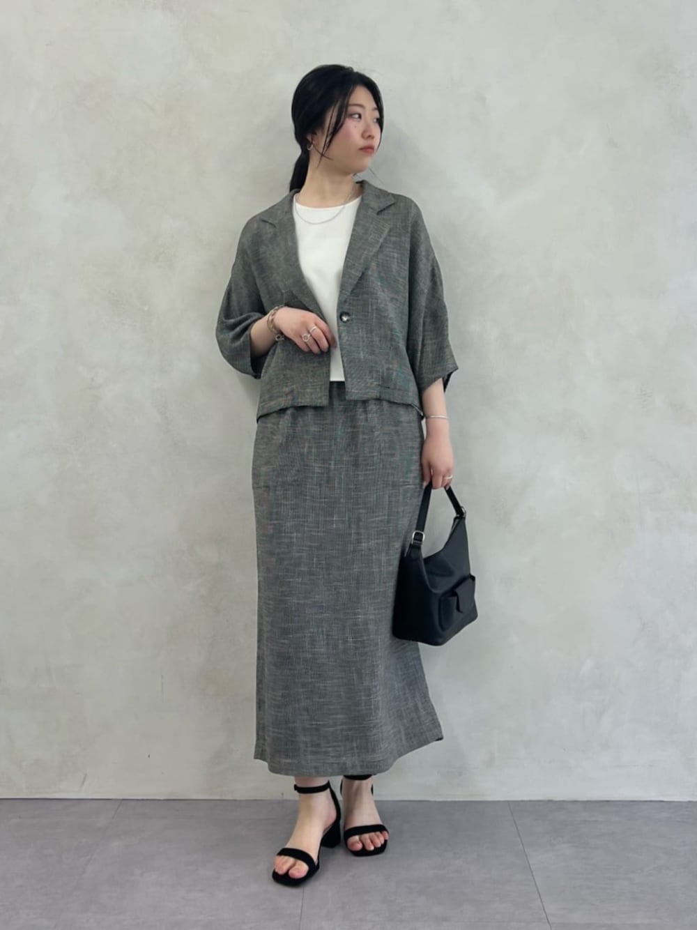 ・tops Fサイズ コクーンシルエットのブラウスは インせずにスカートと合わせられます◎ 二の腕の気になるところはカバーして 方周りがすっきり見える優秀ブラウス! ・skirt Fサイズ モノトーンコーデを格上げしてくれるスカート 裏地も付いているので、一枚でも安心です! ・jacket Fサイズ ハーフスリーブの羽織は夏まで活躍する優れもの。 スカートと合わせてセットアップにすれば 一気にお出かけコーデに!